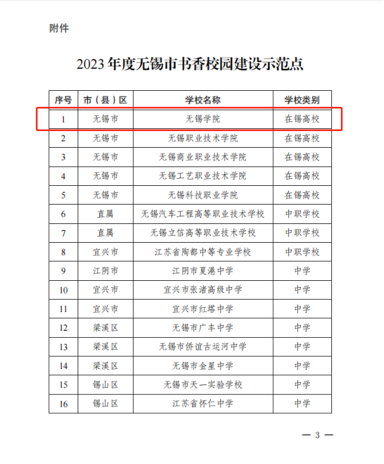 近日,无锡市教育局、无锡市全民阅读活动领导小组办公室、无锡市语言文字工作委员会办公室发布了《市教育局等三部门关于公布2023 年度无锡市书香校园建设示范点的通知》(锡语办发〔2023〕4 号),我校成功入选。