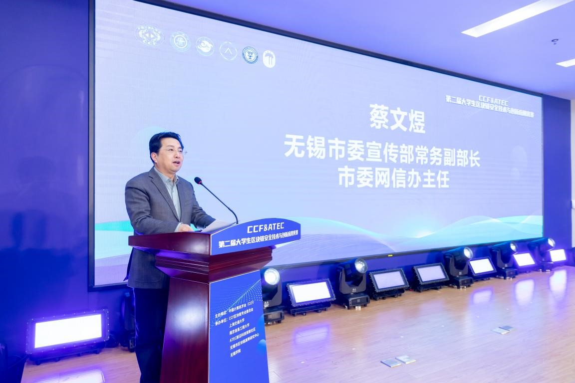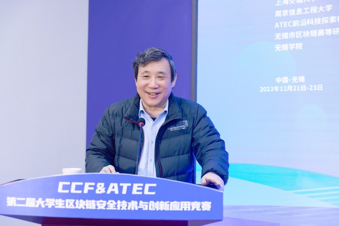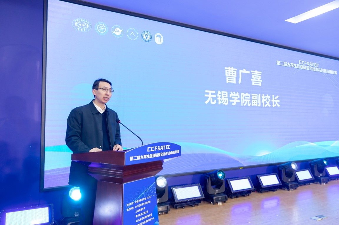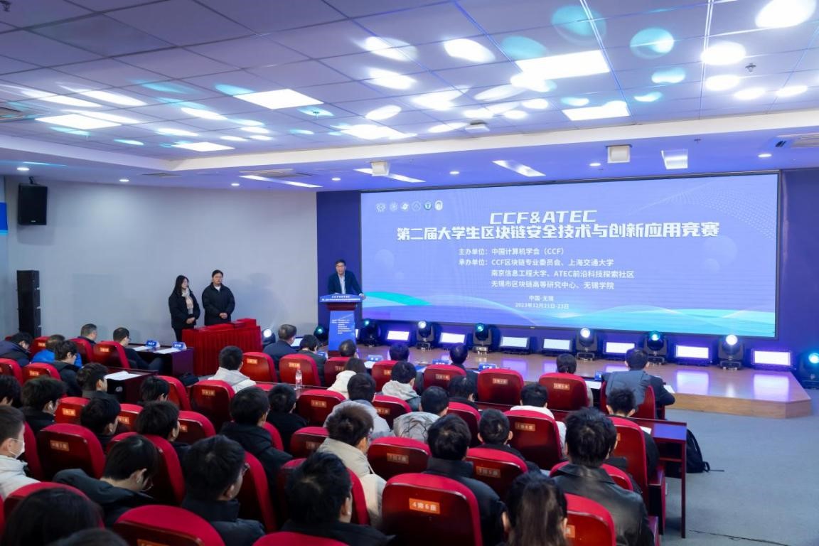 12月22日至23日,由中国计算机学会(CCF)主办,CCF区块链专业委员会、上海交通大学、南京信息工程大学、无锡学院、ATEC前沿科技探索社区与无锡市区块链高等研究中心联合承办的第二届大学生区块链安全技术与创新应用竞赛在我校举办。无锡市委宣传部常务副部长、市委网信办主任蔡文煜,锡山区委常委、翠屏山旅游度假区党组书记钱斌,CCF区块链专委会主任斯雪明,无锡市区块链高等研究中心执行主任骆源参加竞赛开幕式并致辞。我校副校长曹广喜受邀出席并致欢迎词。