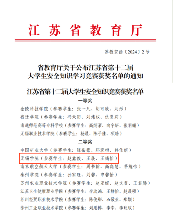 1月15日,省教育厅公布了江苏省第十二届大学生安全知识学习竞赛获奖名单,我校赵鑫俊、王展、王婧怡三位同学组成的代表队荣获省二等奖。