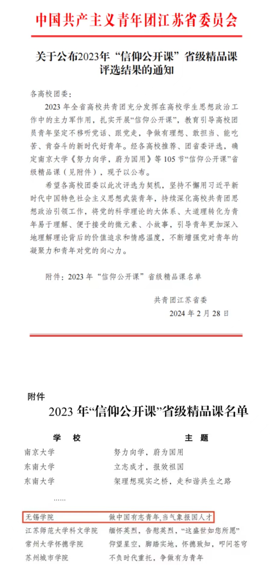 近日,由共青团江苏省委员会主办的2023年全省高校“信仰公开课”省级精品课评选结果公布,确定评选出105节“信仰公开课”省级精品课。我校申报的课程《做中国有志青年,当气象报国人才》在全省高校报送的作品中脱颖而出,获评“省级精品课”。