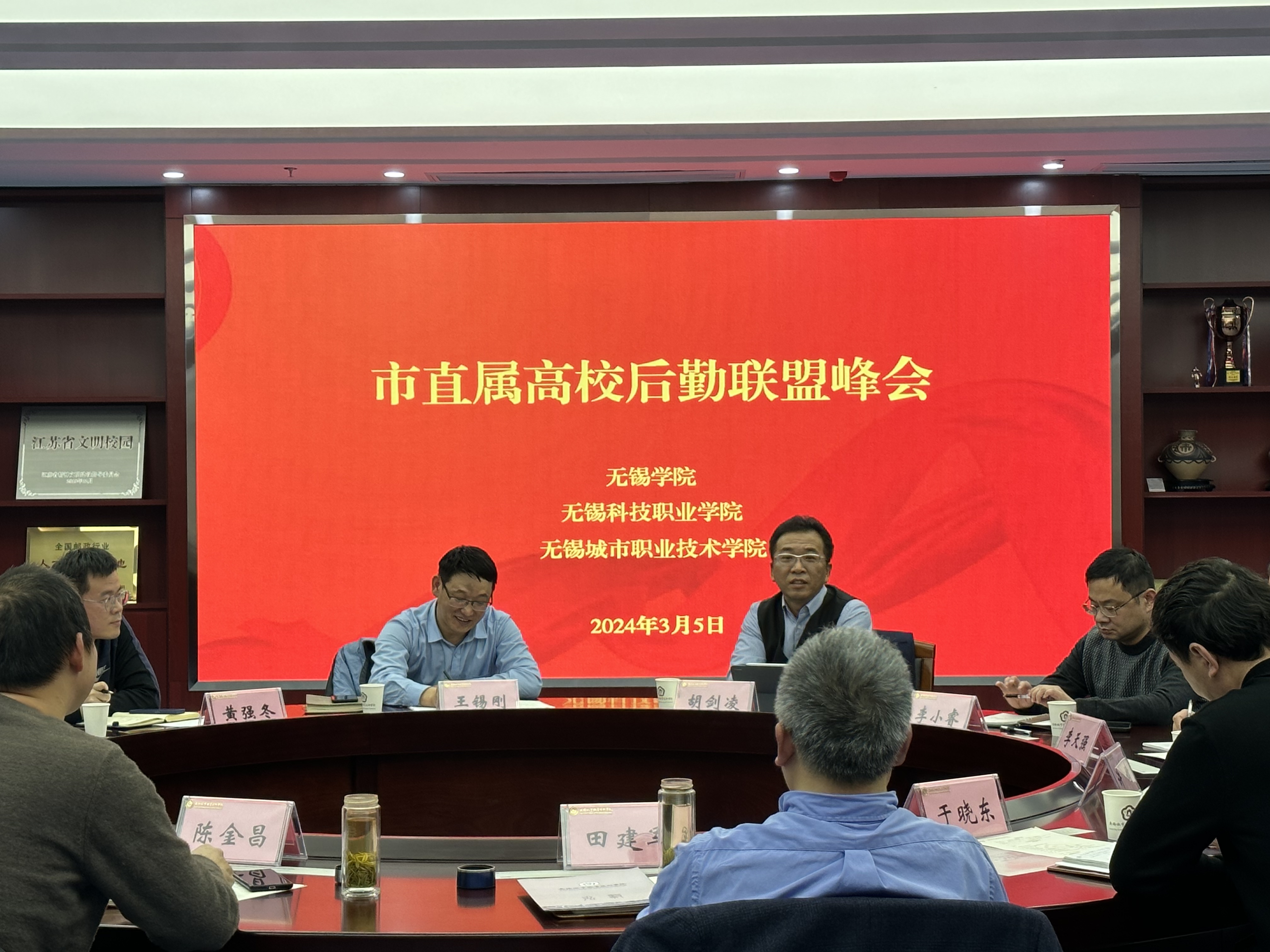 为切实加强市属高校后勤管理工作的经验交流与合作共建,3月5日上午,副校长胡剑凌带队赴无锡城市职业技术学院调研交流。无锡城市职业技术学院副院长田建军、无锡科技职业技术学院副院长王锡刚及两校后勤相关领导出席会议。我校后勤管理处(基建处)工作人员参加调研。会议由无锡城市职业技术学院后勤处副处长陈金昌主持。
