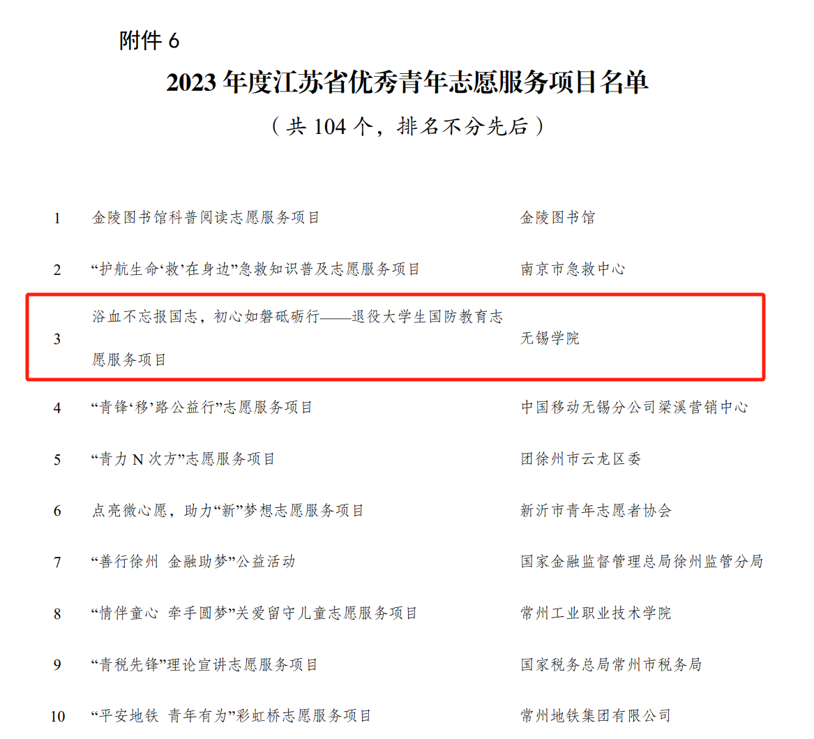 近日,江苏省青年志愿者协会公布了2023年度全省青年志愿者行动先进典型评选结果,我校“浴血不忘报国志,初心如磐砥砺行——退役大学生国防教育志愿服务项目”获2023年度江苏省优秀青年志愿服务项目。