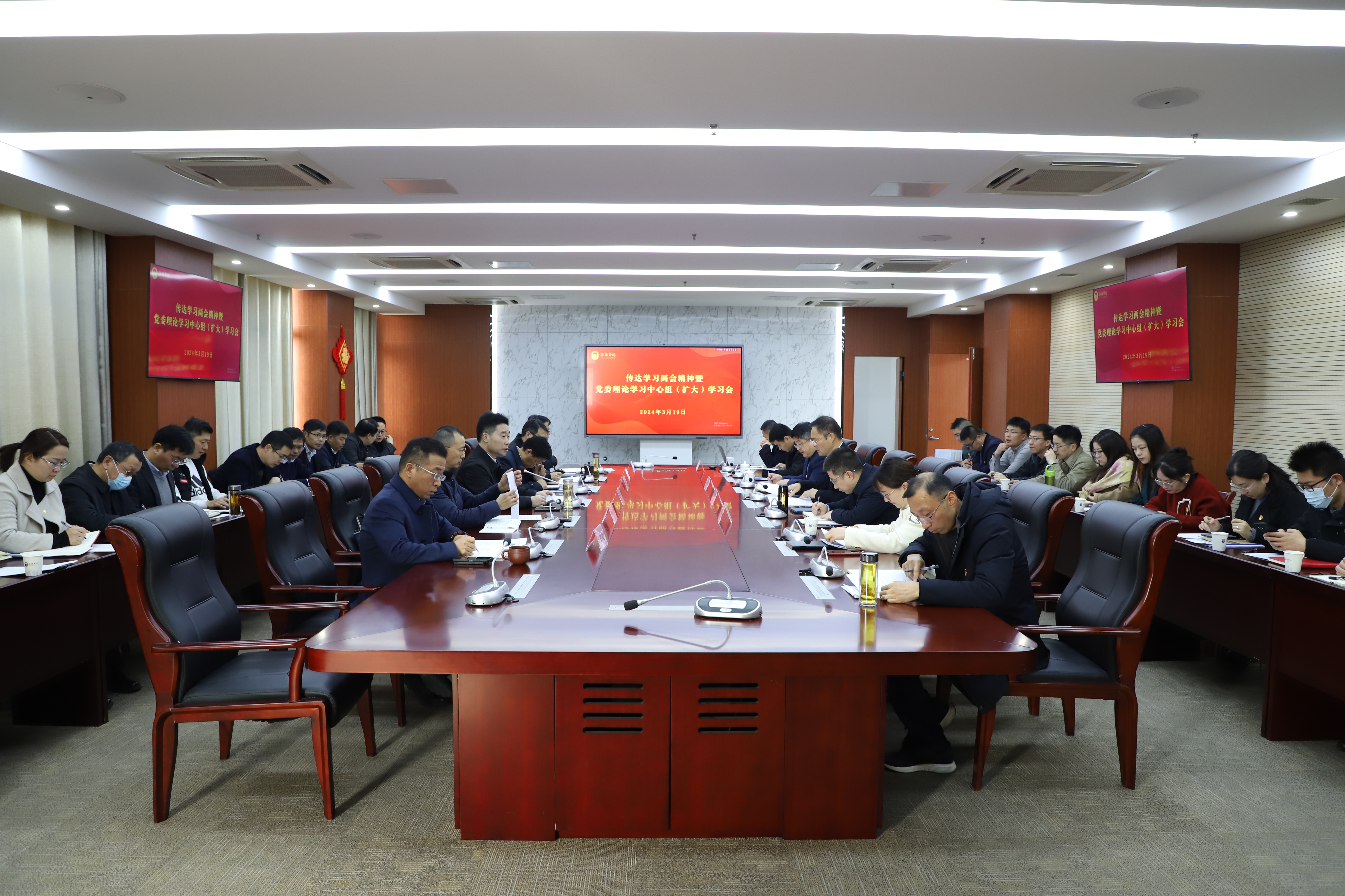 3月19日上午,我校召开传达学习2024年全国两会精神暨党委理论学习中心组(扩大)学习会。校党委书记杨建新主持会议并传达习近平总书记重要讲话精神,全体校领导、党委委员、各职能部门负责人、各二级党组织负责人参加会议。