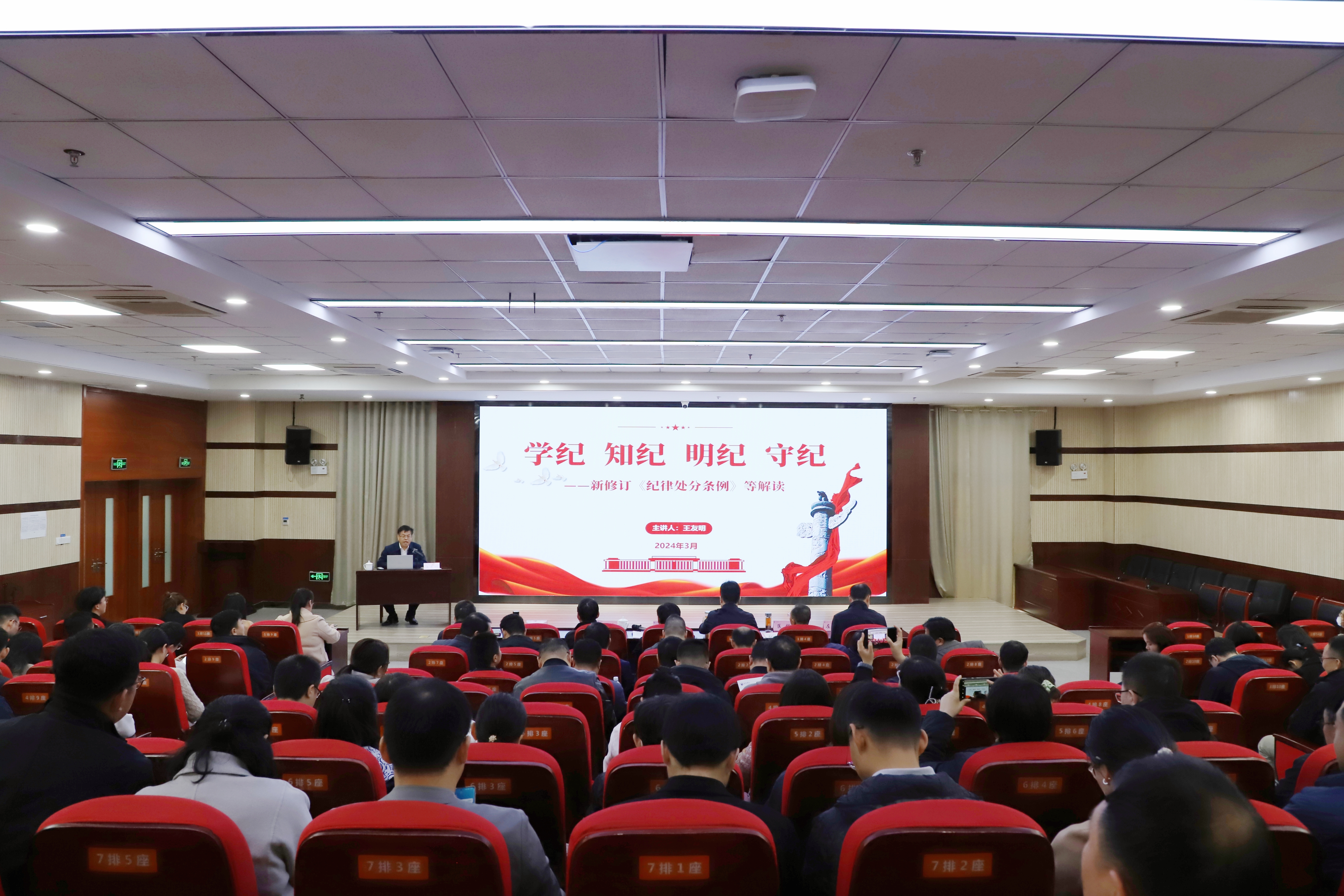 随后,王友明作了题为《学纪 知纪 明纪 守纪》的专题讲座,围绕新修订《中国共产党纪律处分条例》、党的六大纪律、最新《事业单位工作人员处分规定》等内容进行了重点解读。