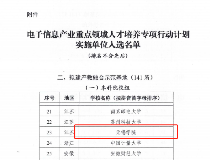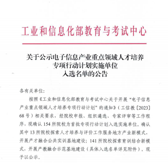 近日,在国家工业和信息化部教育与考试中心公示的“电子信息产业重点领域人才培养专项行动计划”中,我校成功入选首批“产教融合示范基地”实施单位。