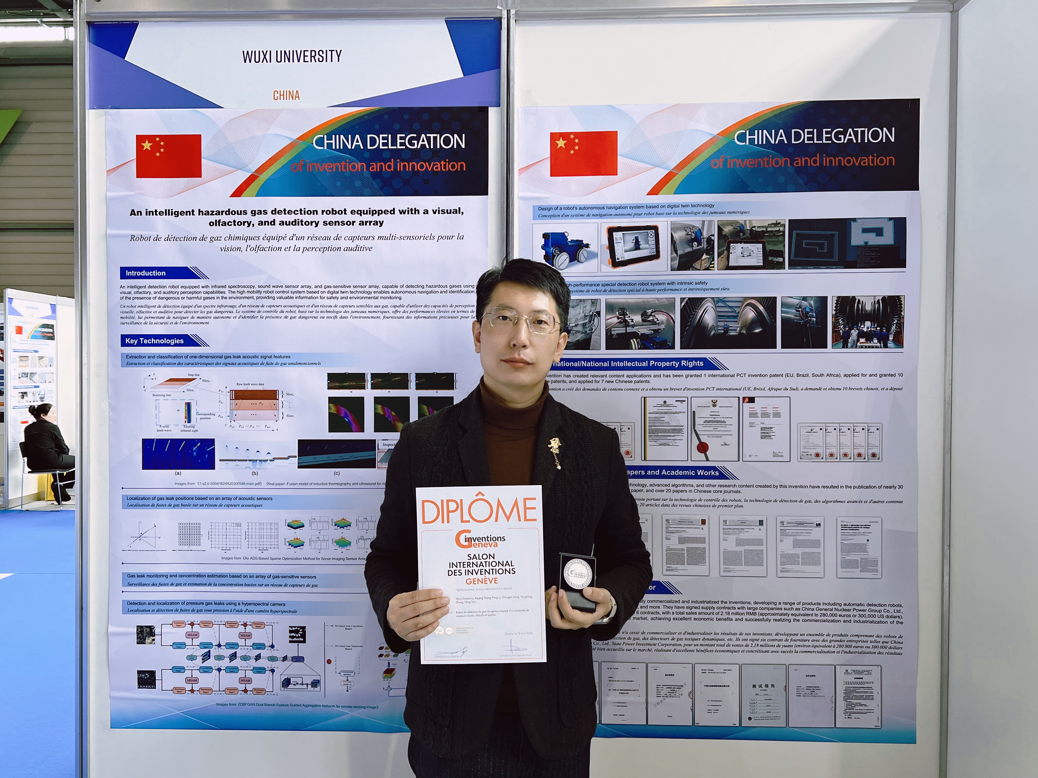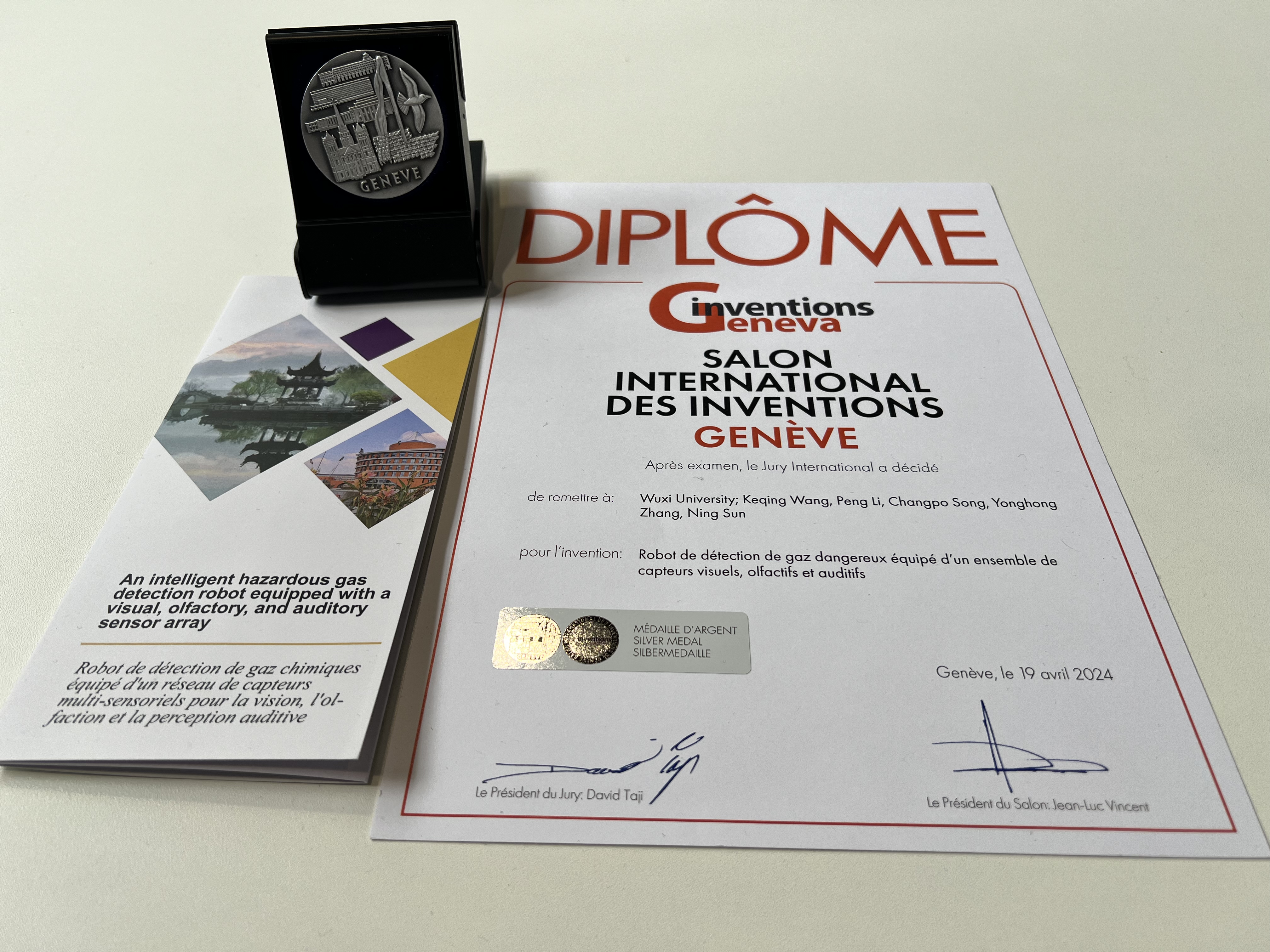 瑞士当地时间2024年4月16日至21日,第49届日内瓦国际发明展在瑞士日内瓦举办,本次展会共吸引来自40多个国家和地区的近1100项发明项目参展,中国代表团共计参展196个发明项目。我校创新成果“携带视嗅听觉传感器阵列的危化气体检测机器人”最终在本次国际发明展中获银奖。