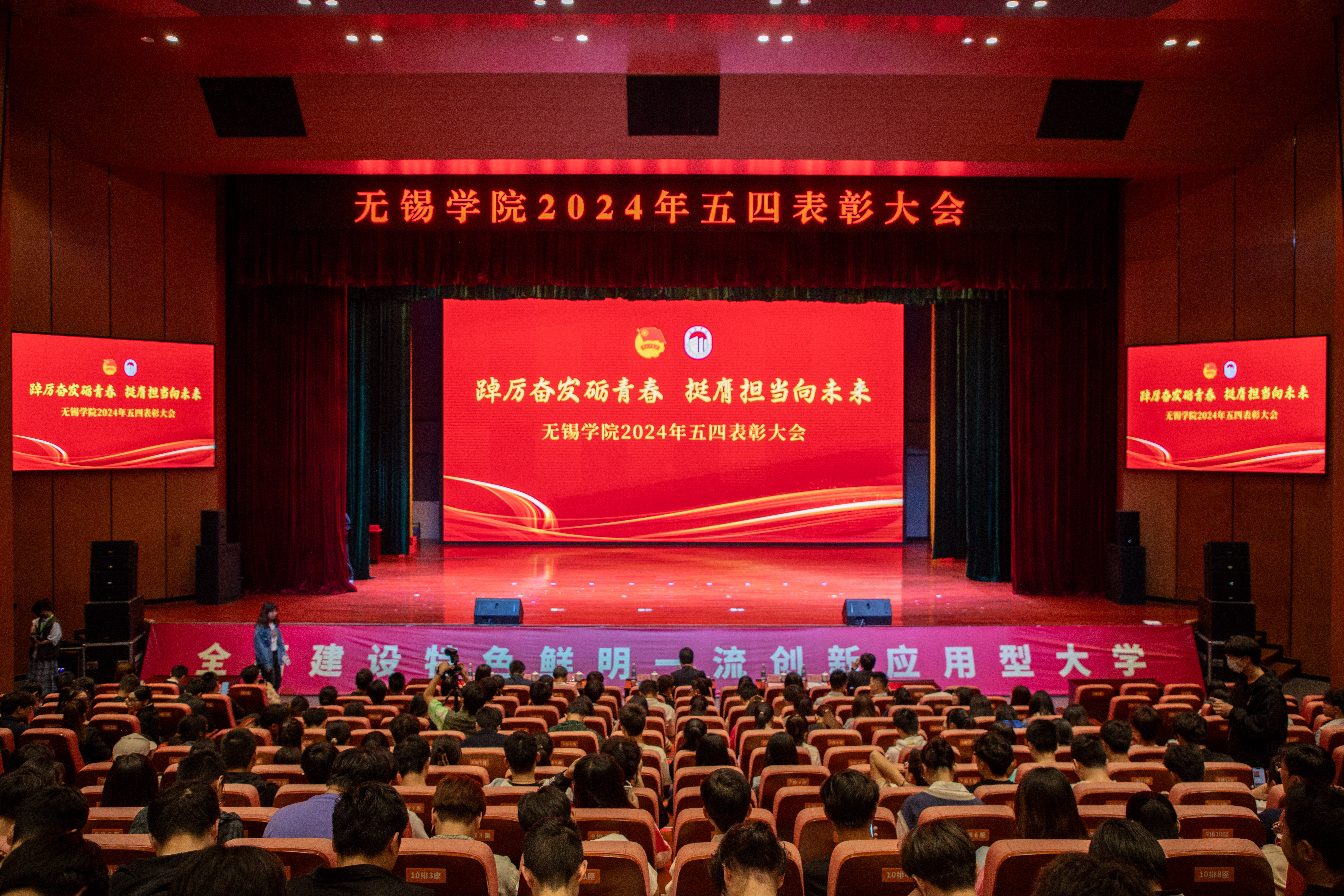 为弘扬五四精神,表彰先进典型,激励全校广大团员青年砥砺奋发,挺膺担当,4月29日晚,无锡学院2024年“五四”表彰大会在大礼堂二楼举行。校党委书记杨建新,党委常委、副校长左同宇出席本次活动。相关党群部门负责人,各学院党总支副书记、学办主任及500余名团员青年代表参会。