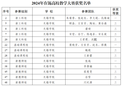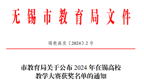 近日,由无锡市教育局高等教育处主办的“第一届在锡高校教学大赛”评选结果揭晓。经过激烈角逐,在锡本科高校组共评选出51项,我校教师团队荣获一等奖3项、二等奖1项、三等奖9项。