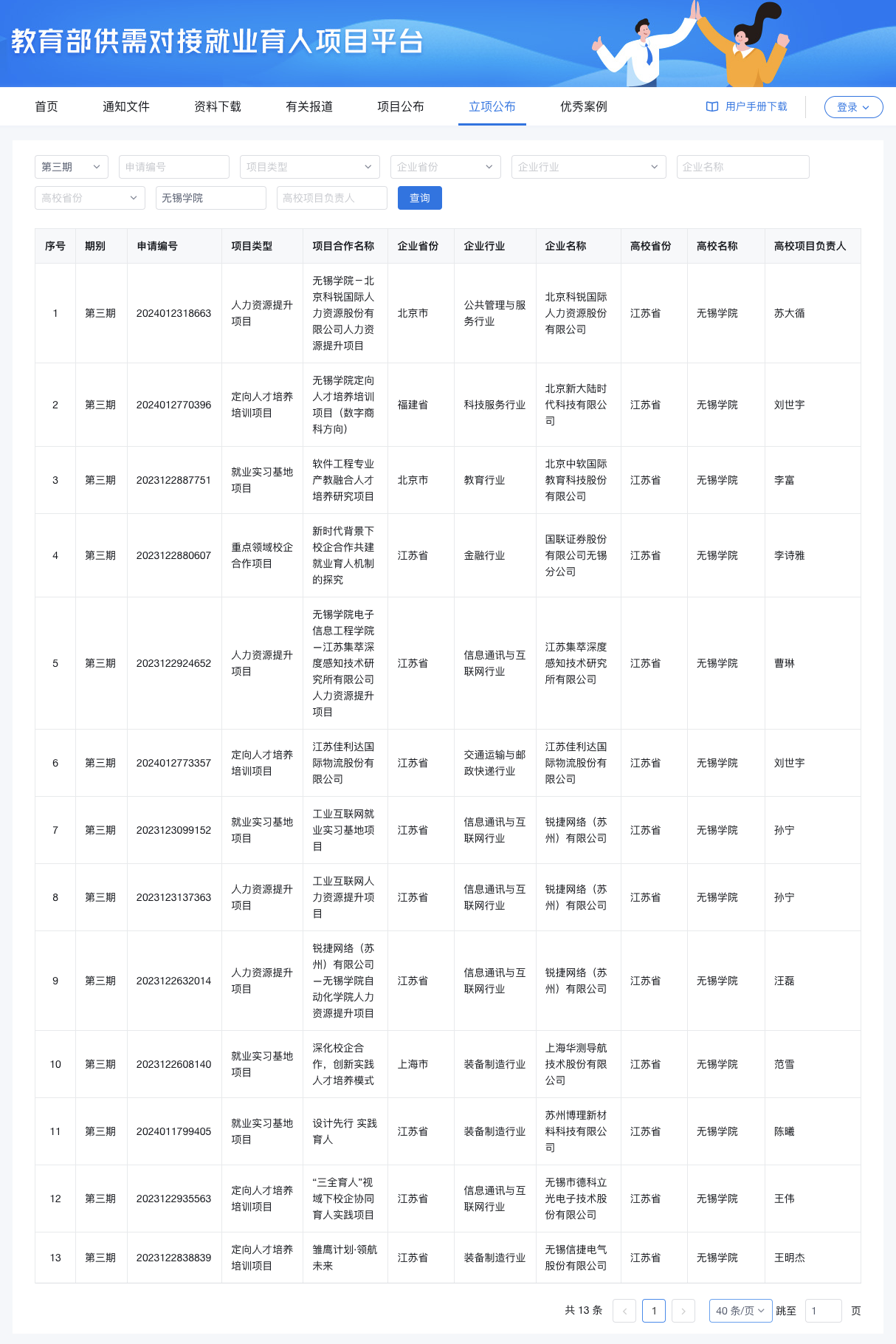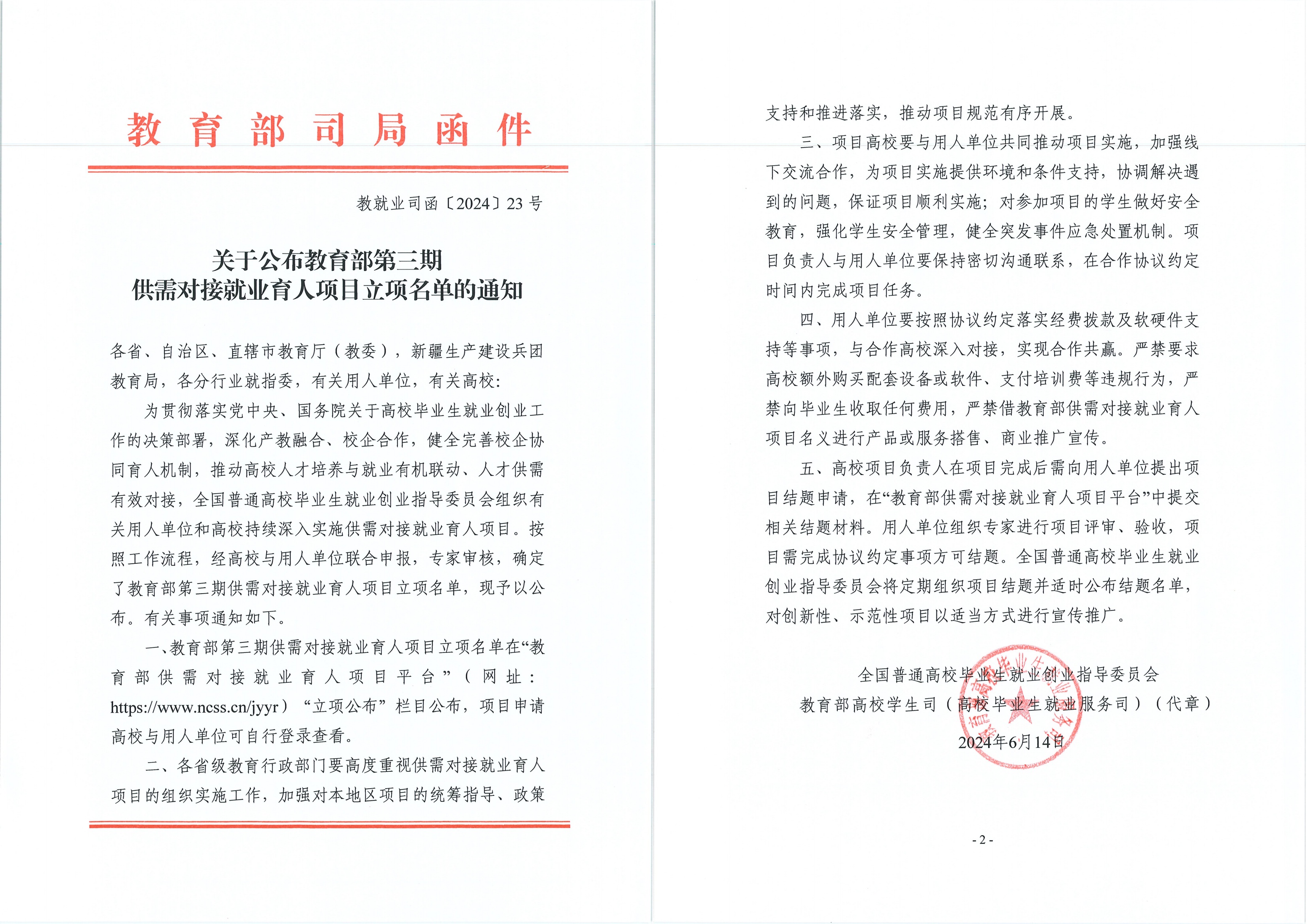 6月14日,教育部高校学生司(高校毕业生就业服务司)发布《关于公布教育部第三期供需对接就业育人项目立项名单的通知》,我校13个供需对接就业育人项目获批立项,其中就业实习基地项目4个,人力资源提升项目4个,定向人才培养培训项目4个,重点领域校企合作项目1个,实现获批数量的新突破。