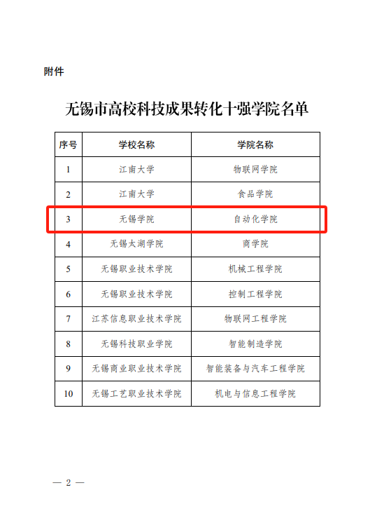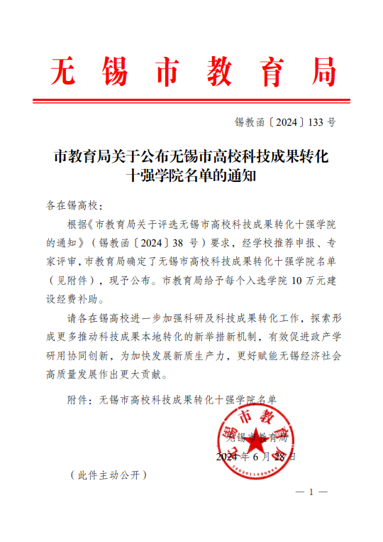 近日,市教育局公布无锡市高校科技成果转化十强学院名单,我校自动化学院凭借其在科技成果转化方面的卓越表现,荣获无锡市十强科技成果转化学院荣誉称号。