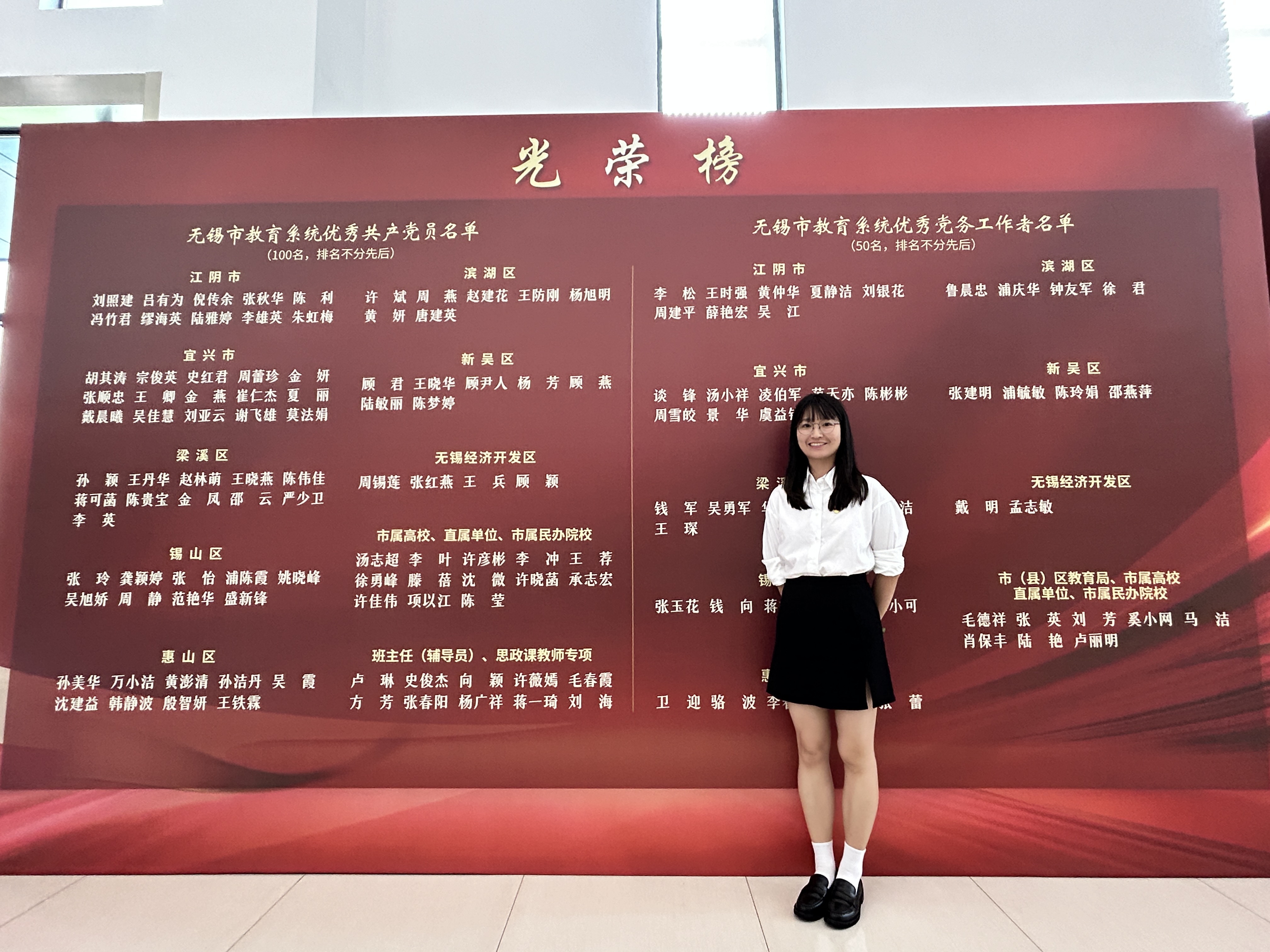 7月1日下午,无锡市委教育工委举行中国共产党成立103周年主题党日活动。会上表彰了全市教育系统优秀共产党员、优秀党务工作者和先进基层党组织,我校辅导员蒋一琦老师荣获“无锡市教育系统优秀共产党员”。作为我校留学生辅导员,蒋一琦老师自入职以来始终秉持共产党员开拓创新的思维与求真务实的作风,扎根学生管理一线,累计带教来自全球40多个国家的300余名留学生(本科生)。她以“构建人类命运共同体、创造人类文明新形态”理念为根本遵循,引领留学生感知中国式现代化,探索出“浸润、融合、突破”三步走的留学生高质量培养路径,塑造有情怀、有温度、有风格的教育管理服务模式。她带教的毕业生中,有70余名进入南京大学、复旦大学、上海交通大学、西安交通大学、北京师范大学、华南理工大学等国内知名高校深造。蒋一琦老师坚守政治方向,对标外事工作要求,在辅导员素质能力、跨文化交际能力、外语能力等方面不断精进。先后获得国家人社部二级口译证、上海高级口译证,荣获第十届江苏省高校辅导员素质能力大赛决赛一等奖,取得我校该赛事的重大历史突破。此外,还获得第十届江苏省高校辅导员素质能力大赛复赛二等奖、第十三届江苏省“辅导员年度人物”入围奖、江苏省优秀留学生辅导员、外研社全国英语辩论挑战赛特等奖暨最佳辩手、第二届无锡高校辅导员素质能力大赛一等奖、无锡市英语教学大赛特等奖等荣誉。蒋一琦老师的先进事迹被江苏省高校网络思想政治工作中心官方公众号“苏思享”专题报道。