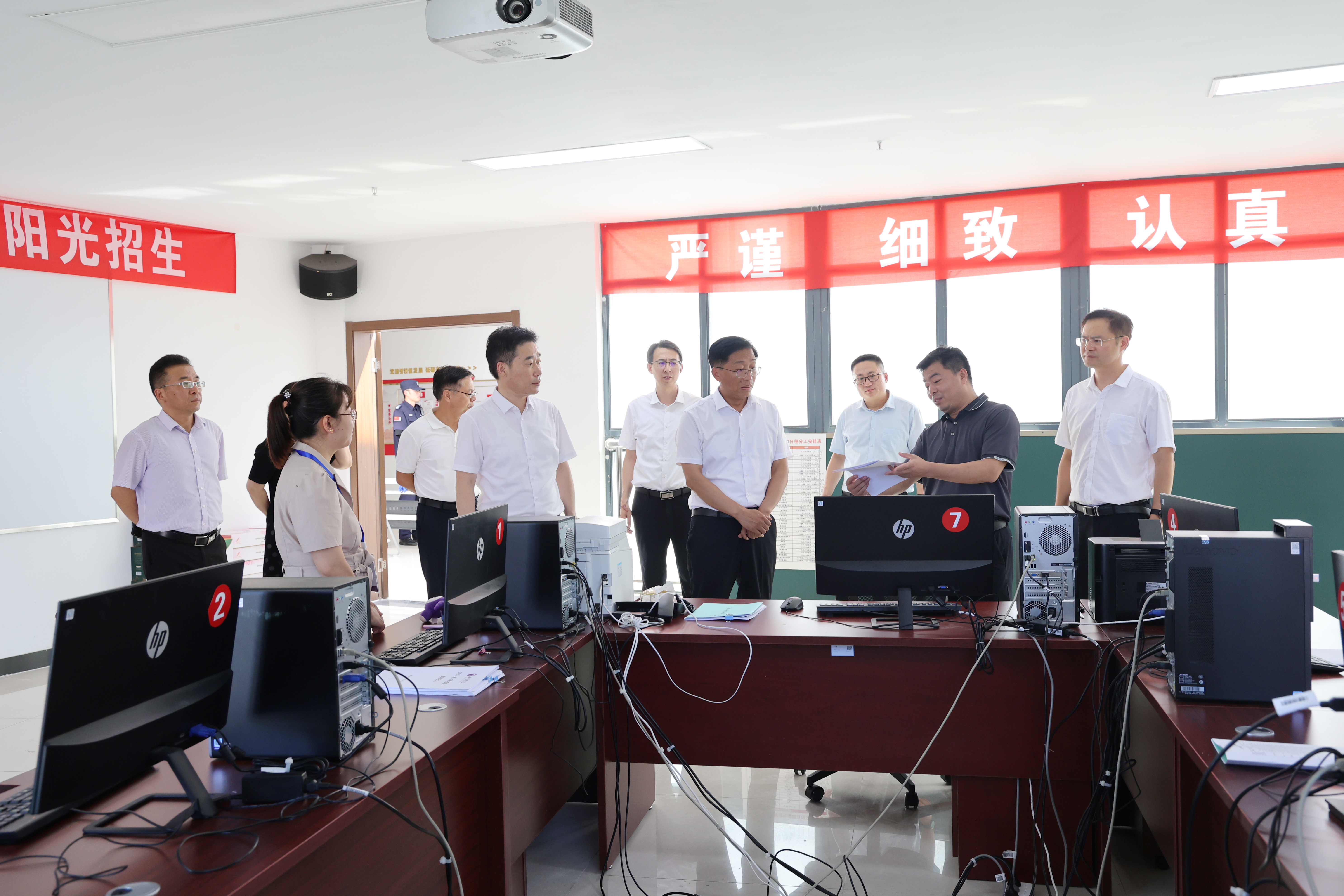 在招生录取工作现场,校领导与招生录取工作人员亲切交谈,详细了解招生录取工作进展、各省份投档分数线、录取通知书发放等情况,并嘱托大家招生录取工作关系着学校的声誉和办学质量,务必要以高度负责的态度,认真细致做好招录工作,严守招生纪律,落实规范要求,强化服务意识,加大宣传力度,确保招生录取工作公平公正平稳有序。