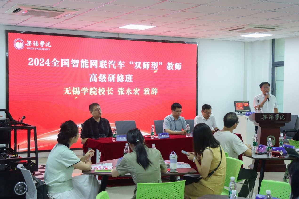 校长张永宏作开班致辞,他向全体参训教师表示热烈欢迎并围绕学校发展历程、办学特色、学科专业、发展目标等作简要介绍,重点强调了学校在车联网产业学院建设方面的创新发展模式、实施路径和现阶段的建设成果。他表示,作为全国唯一的省部级车联网产业学院,始终坚持以学生发展为中心、以产业需求为导向、以创新教学为驱动、以科学研究为助推、以成果转化为促进,强化“产学研转创用”体系建设,加强高素质应用型人才培养。他希望,学校要以此次研修班为契机,继续发挥自身优势,加强与智能网联汽车相关行业企业、科研院所的合作与交流,促进科技成果的转化和应用,为智能网联汽车产业提供更高质量的人才智力支撑和科技创新动能。
