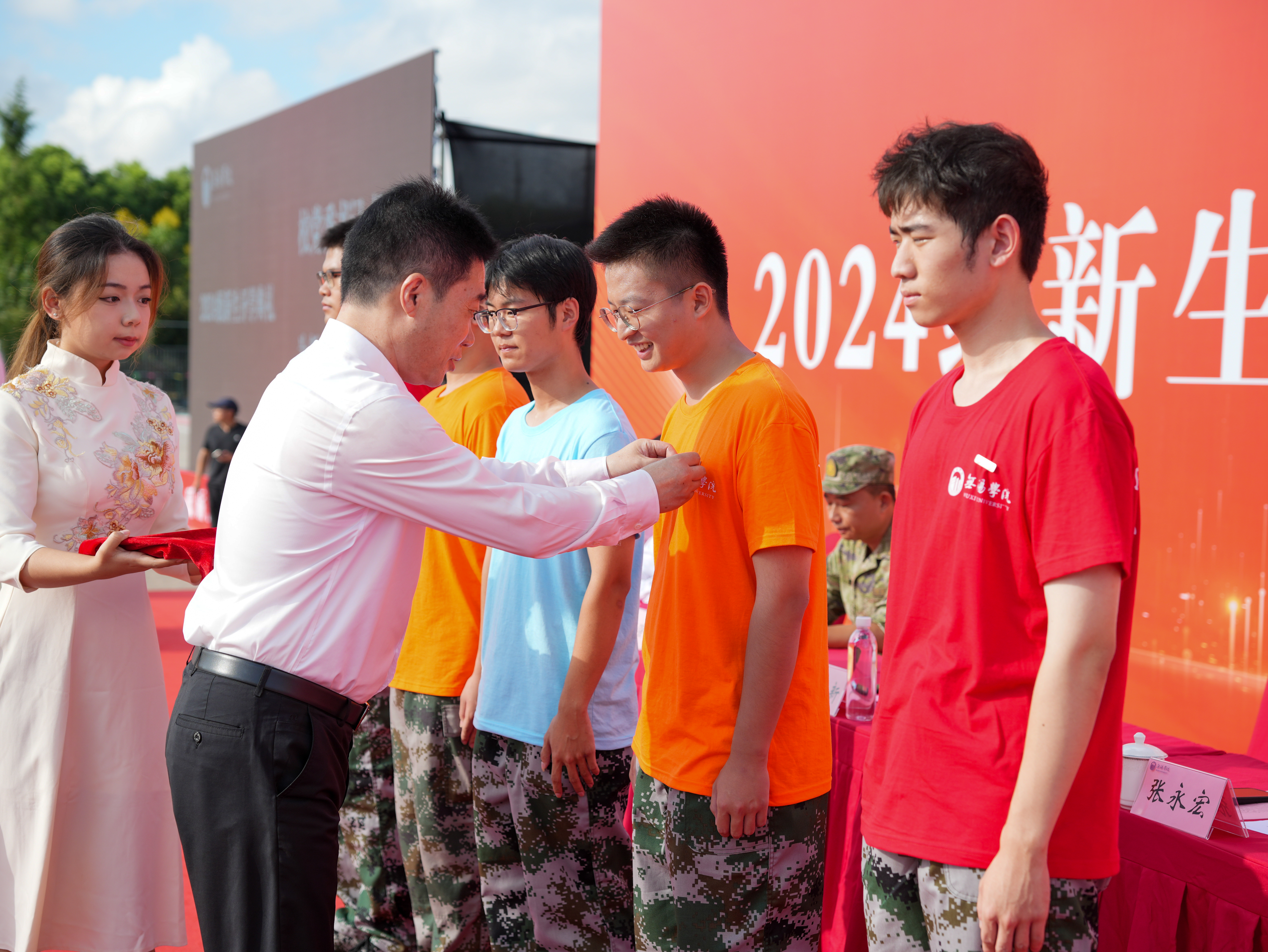 杨建新为新生代表佩戴校徽