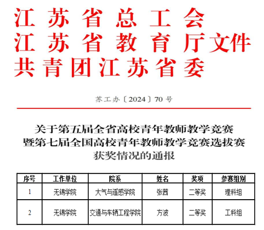 近日,第五届江苏省高校青年教师教学竞赛暨第七届全国高校青年教师教学竞赛选拔赛决赛落下帷幕。本次教学竞赛由省总工会、省教育厅、团省委主办,省教育科技工会承办,来自全省13个设区市教育工会、55所高校工会的180位青年教师同台竞技。经过激烈角逐,我校大气与遥感学院教师张茜获得理科组二等奖,交通与车辆工程学院教师方波获得工科组二等奖,这是我校首次在该赛事中实现全员获奖的成绩突破。