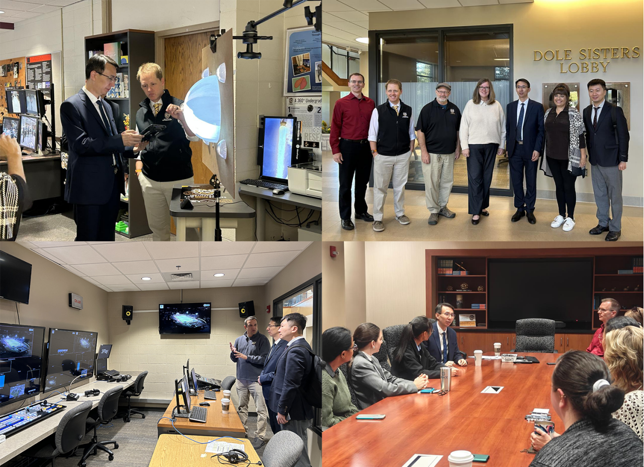 代表团参观了新媒体研究实验室(Institute for New Media Studies)和泰戈尔媒体网络中心(Tiger Media Network)。该中心是美国中部地区最为先进的多媒体中心之一,设有数字摄影棚、电视新闻直播间、广播台及电影拍摄基地等,专为培养传媒专业人才提供服务。信息技术学院院长Melissa Hunsicker教授详细介绍了实验室的主要研究方向和近期取得的成果,特别是在数字媒体技术应用、数据可视化和交互式媒体设计等领域的突破。Nick Schwien教授详细介绍了新媒体研究实验室的基础设施及研究资源的管理情况,并分享了实验室未来的发展规划。他指出,该实验室不仅为师生提供了创新研究的平台,还将作为无锡学院中外合作办学项目学生的专用学习和科研基地,帮助学生在新媒体技术应用中取得更多实践经验。此外,实验室还与美国当地的企业紧密合作,为学生提供实习和就业机会,确保他们能够将所学应用于实际工作中。中心负责人Gordon Carlson详细介绍了各类设备的功能及应用,强调中心不仅支持学生开展新闻制作、广播和电影拍摄等实践活动,还为跨学科项目提供了多元化的平台。
