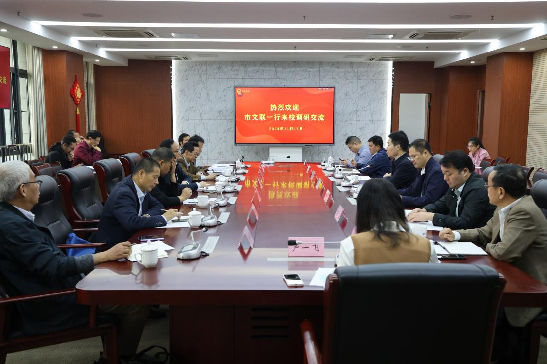 杨建新对市文联一行的到来表示热烈欢迎,并简要介绍了学校发展历程、学科建设、师资队伍、人才培养等基本情况。他表示,学校始终坚持特色化、差异化发展,突出地方性、应用型特点,把准校地协同生命线,聚焦产教融合、人才强校发展思路,不断优化办学模式,努力办好与城市发展产业能级相匹配、与城市文化基因相契合的校地命运共同体大学、产教融合型大学。