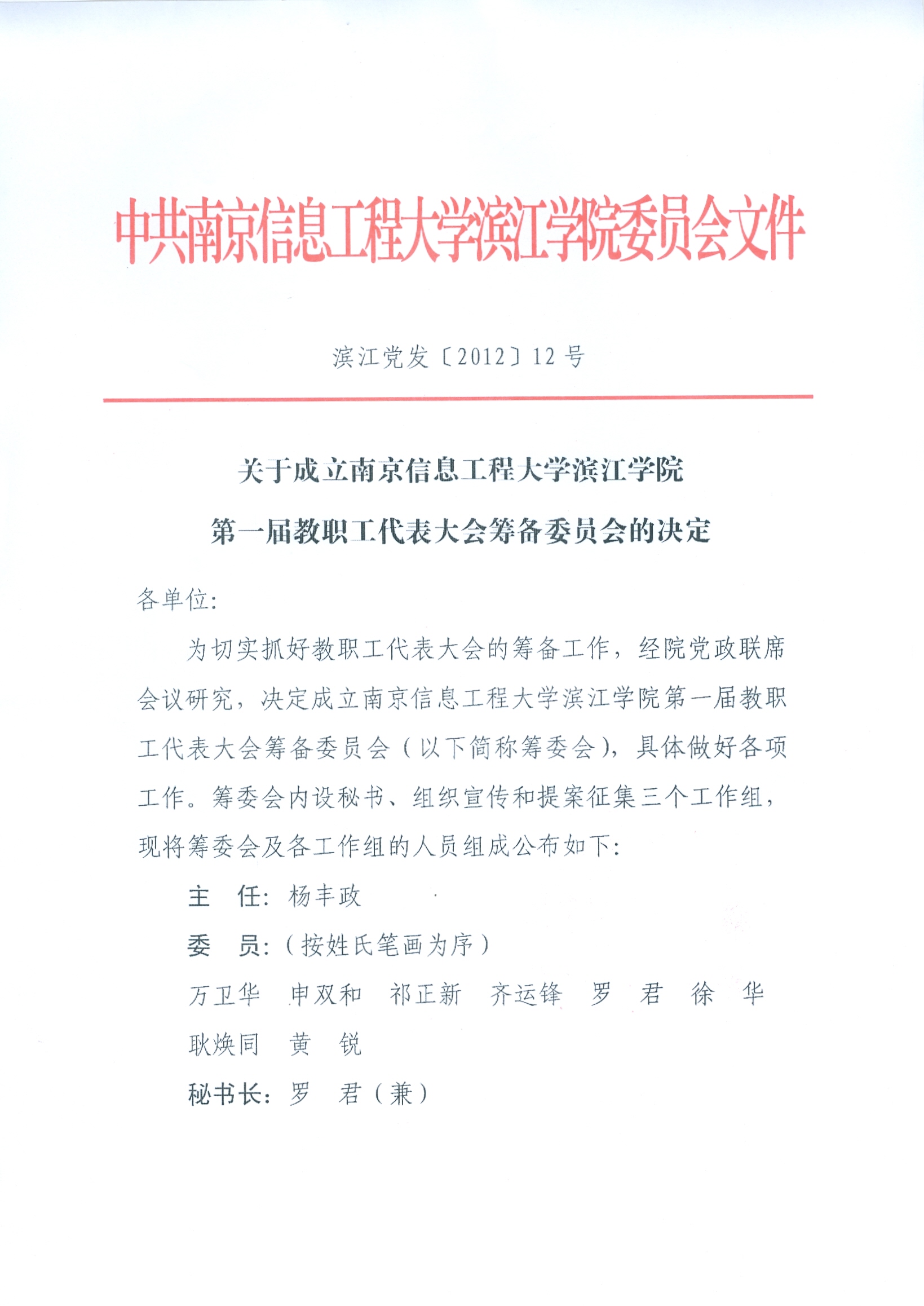 关于成立南京信息工程大学滨江学院第一届教职工代表大会筹备委员会的决定