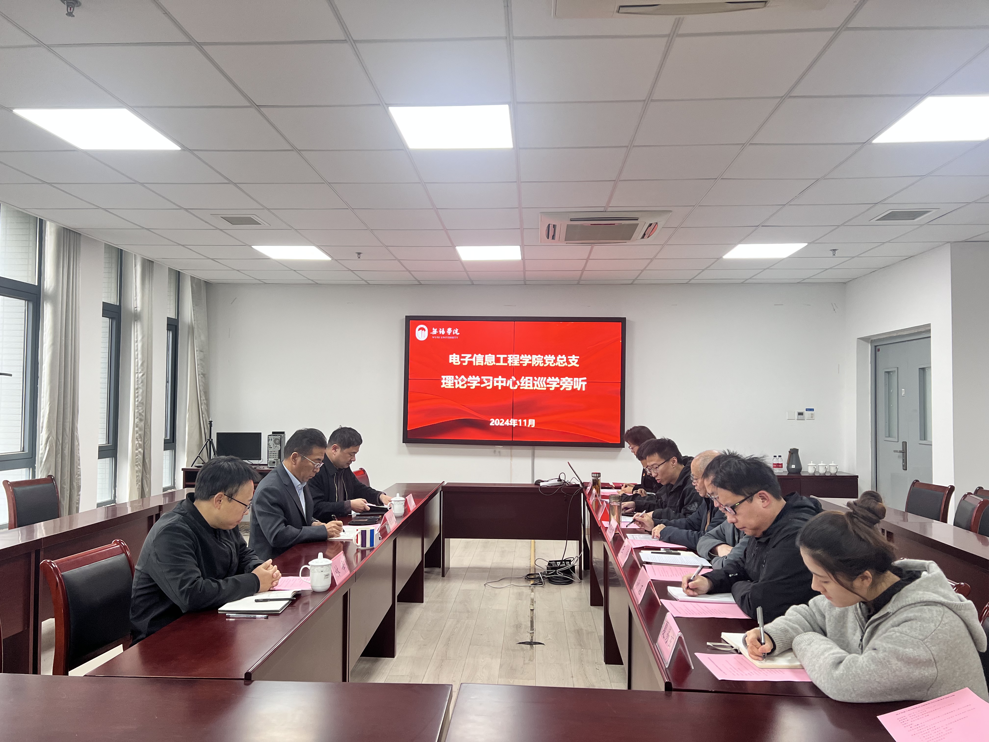 11月20日下午,电子信息工程学院党总支理论学习中心组在思贤楼512会议室召开主题为“紧紧围绕立德树人根本任务,朝着建成教育强国战略目标扎实迈进”的专题学习会。副校长胡剑凌,后勤管理(基建)处处长李小睿、学工处副处长林峰一行到会旁听指导,电子信息工程学院院长郭业才及党总支理论学习中心组成员参加会议。会议由党总支副书记张健主持。