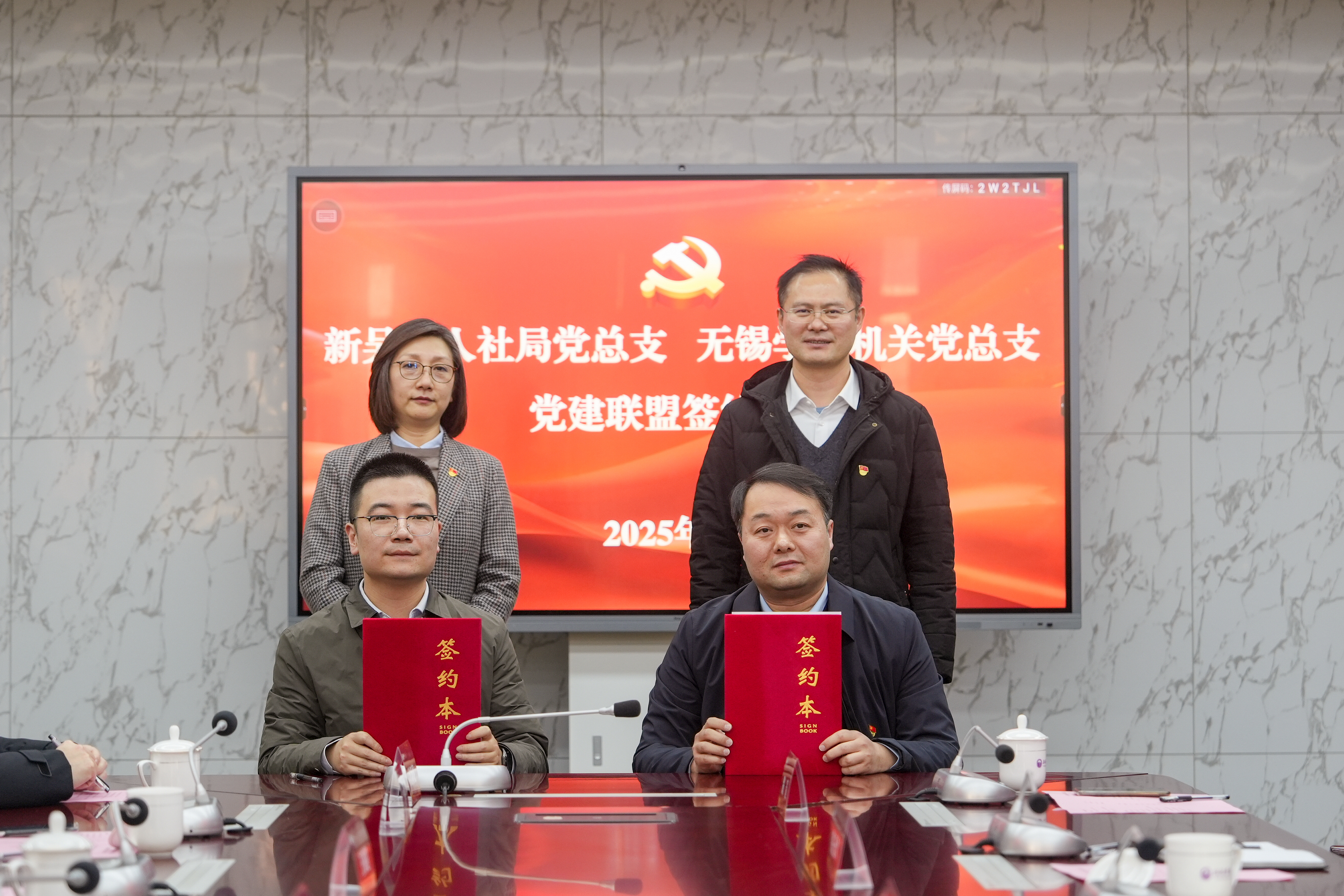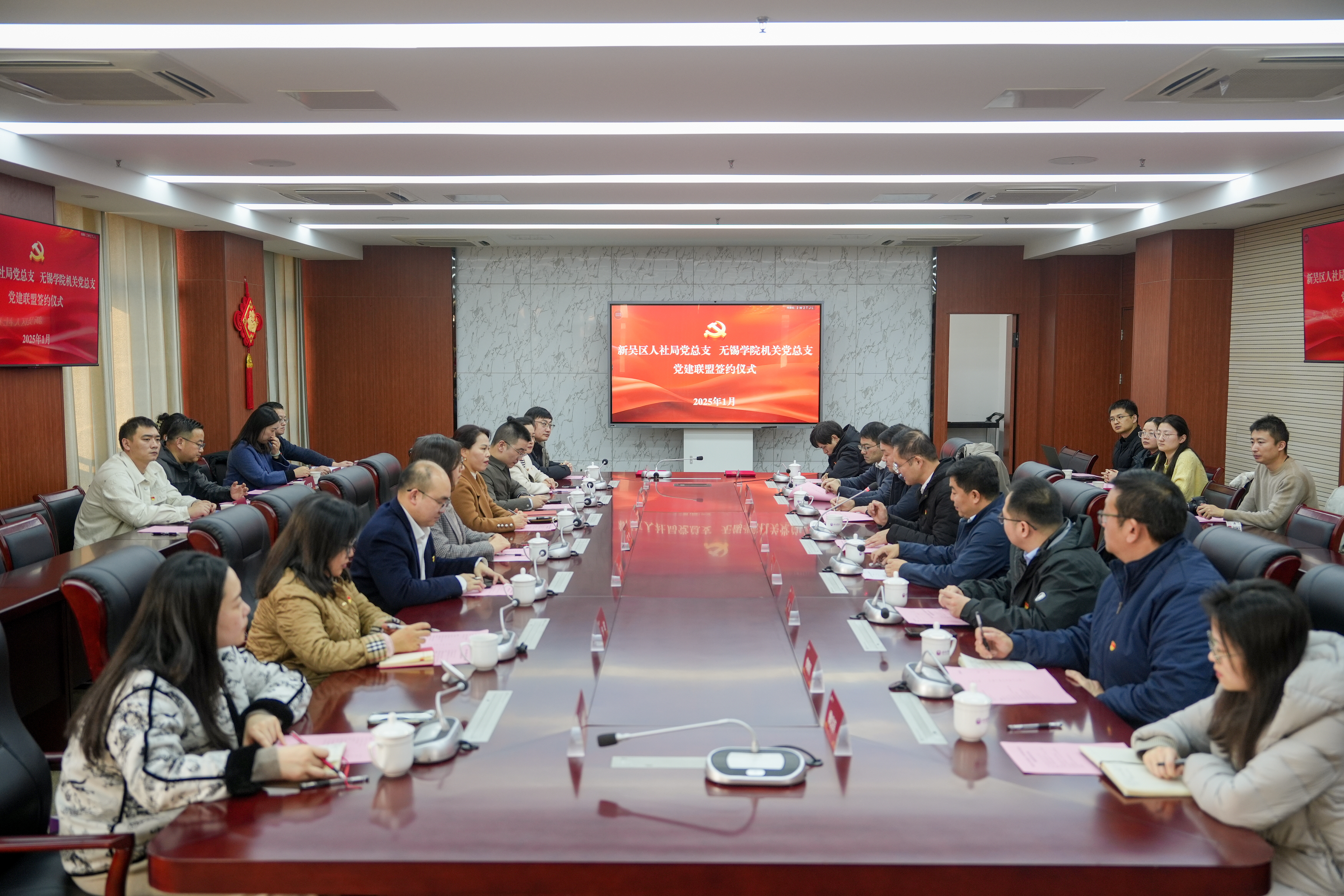 1月8日下午,无锡市新吴区人社局党总支与我校机关党总支举行党建联盟签约仪式,新吴区人社局党组成员、党总支书记、副局长沈爽,副局长王丽华,局党组成员、劳动人事争议仲裁院院长杨勇,局党组成员、办公室主任王谢超,我校党委常委、副校长左同宇,机关党总支书记、学工处处长张灿龙,机关党总支副书记、纪委办主任李步浩等出席签约活动。新吴区人社局党总支党员代表,我校机关党总支部分成员参加会议。