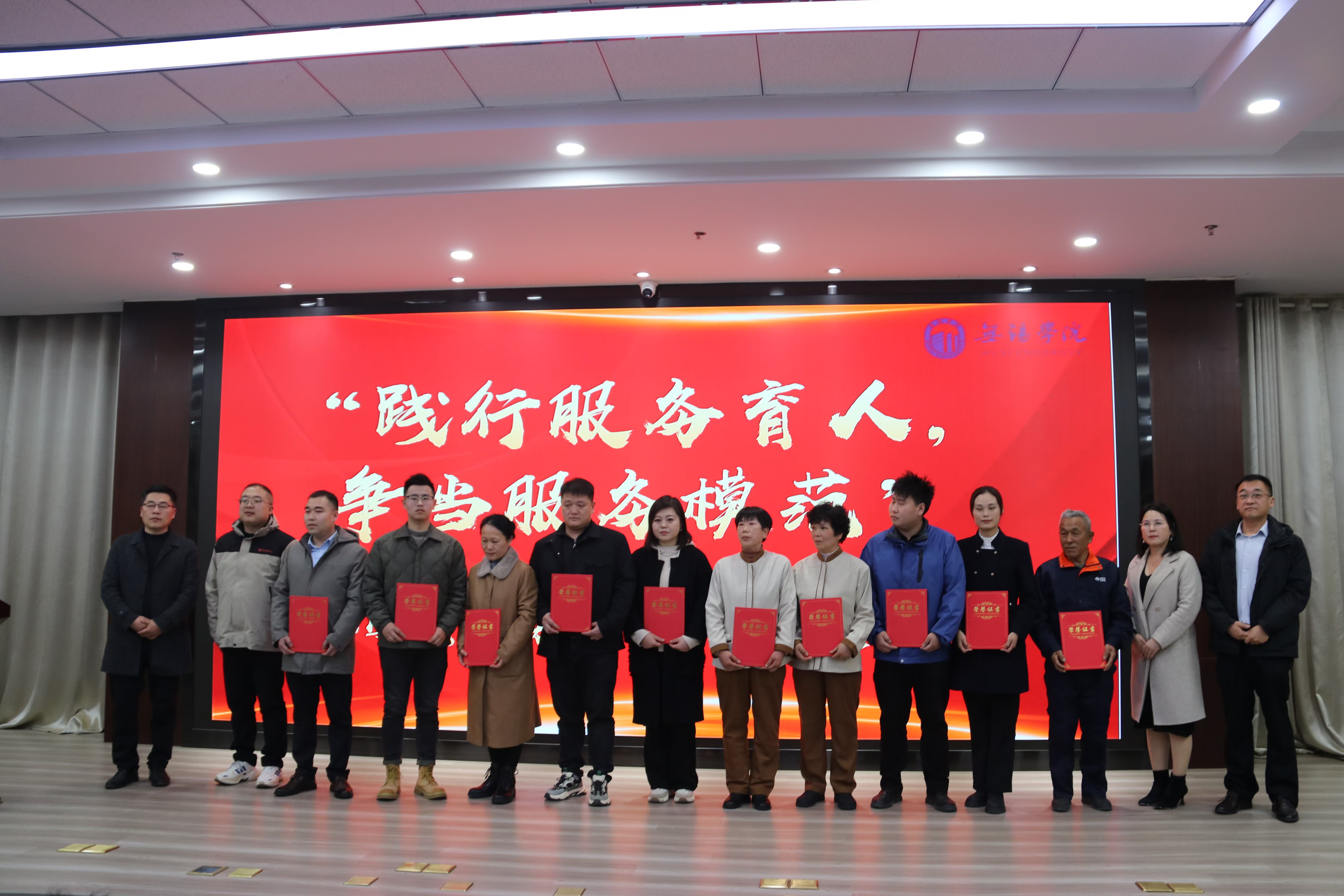 1月20日下午,我校后勤管理处在行政楼121会议室举办“践行服务育人,争当服务模范”后勤工作表彰大会。校党委常委、副校长胡剑凌,后勤管理处处长李小睿,副处长刘文军、李天强,后勤管理处全体员工,服务外包单位负责人及员工代表共计近百人参加此次大会。此次大会对过去一年中在后勤服务工作中表现突出的优秀员工和服务单位进行了表彰,进一步激励全体后勤团队以更加饱满的热情投入工作,为学校的高质量发展贡献力量。