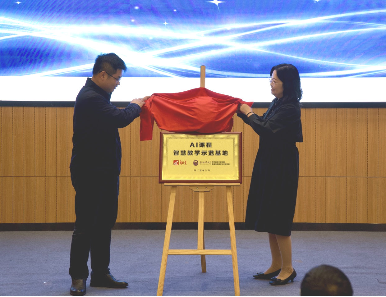 电子信息工程学院院长李松斌和超星集团江苏分公司副总经理雷佳共同为“AI课程智慧教学示范基地”揭牌。