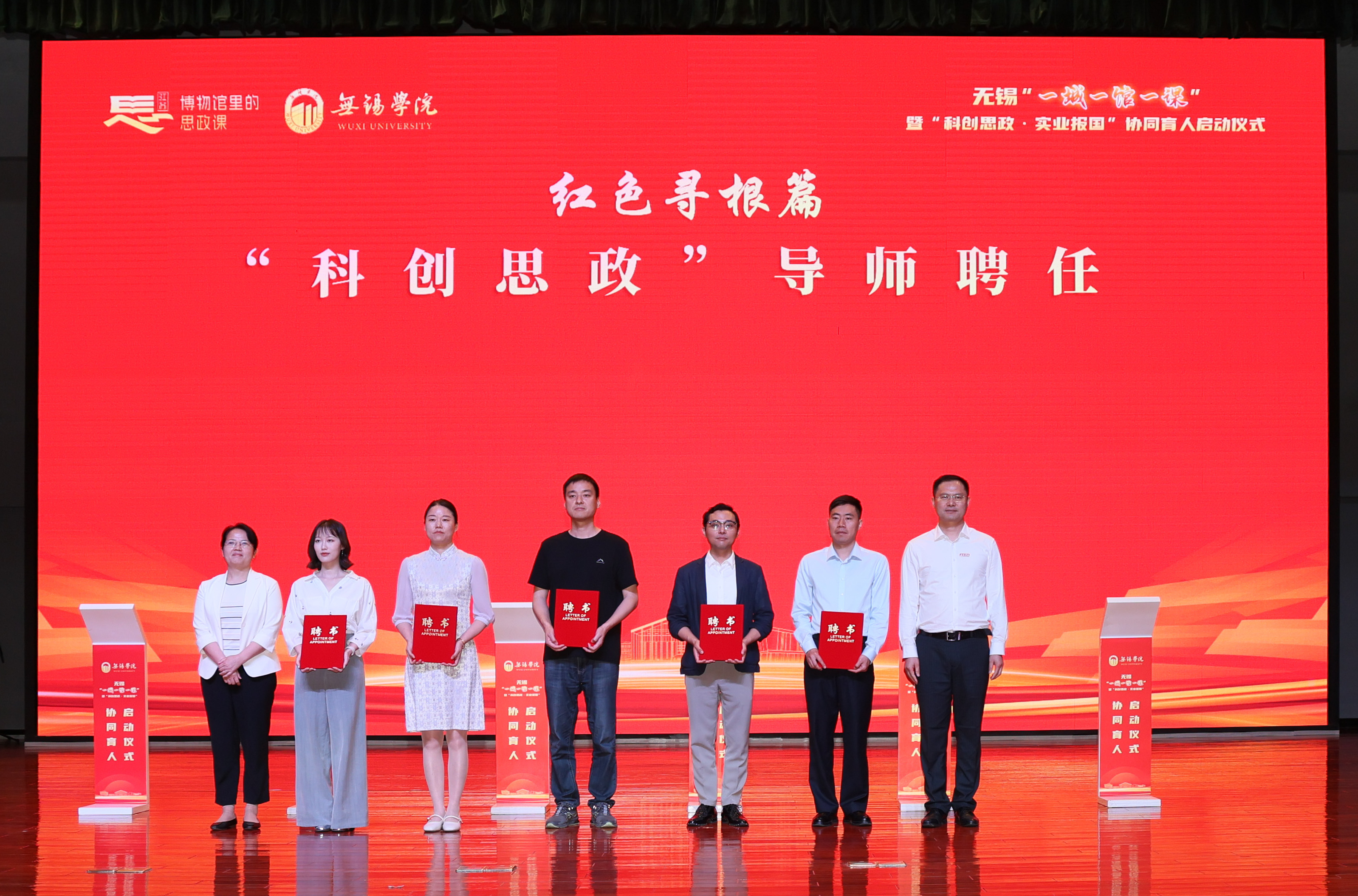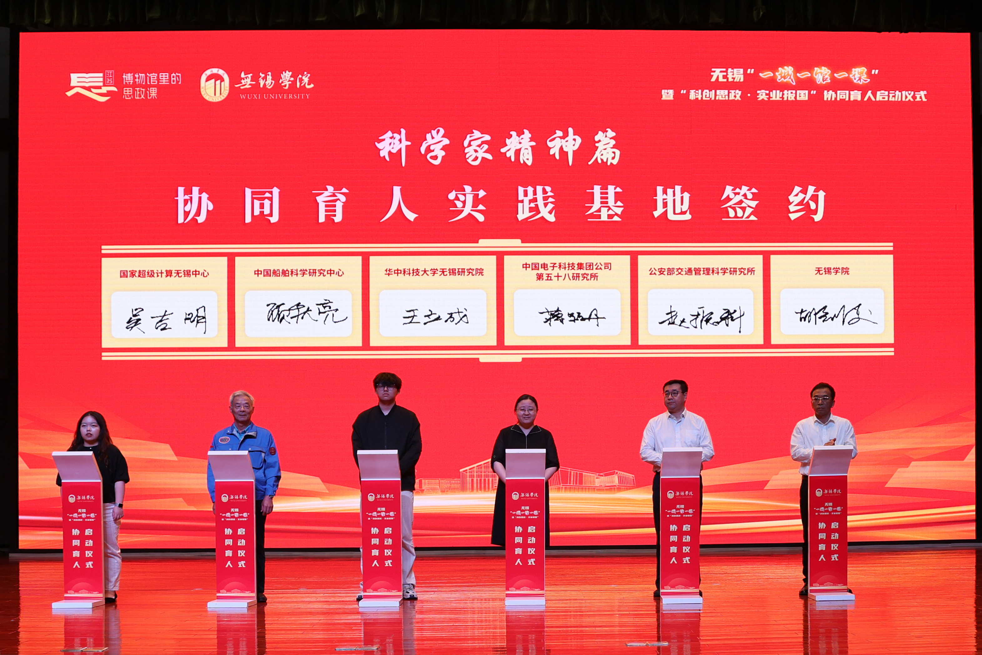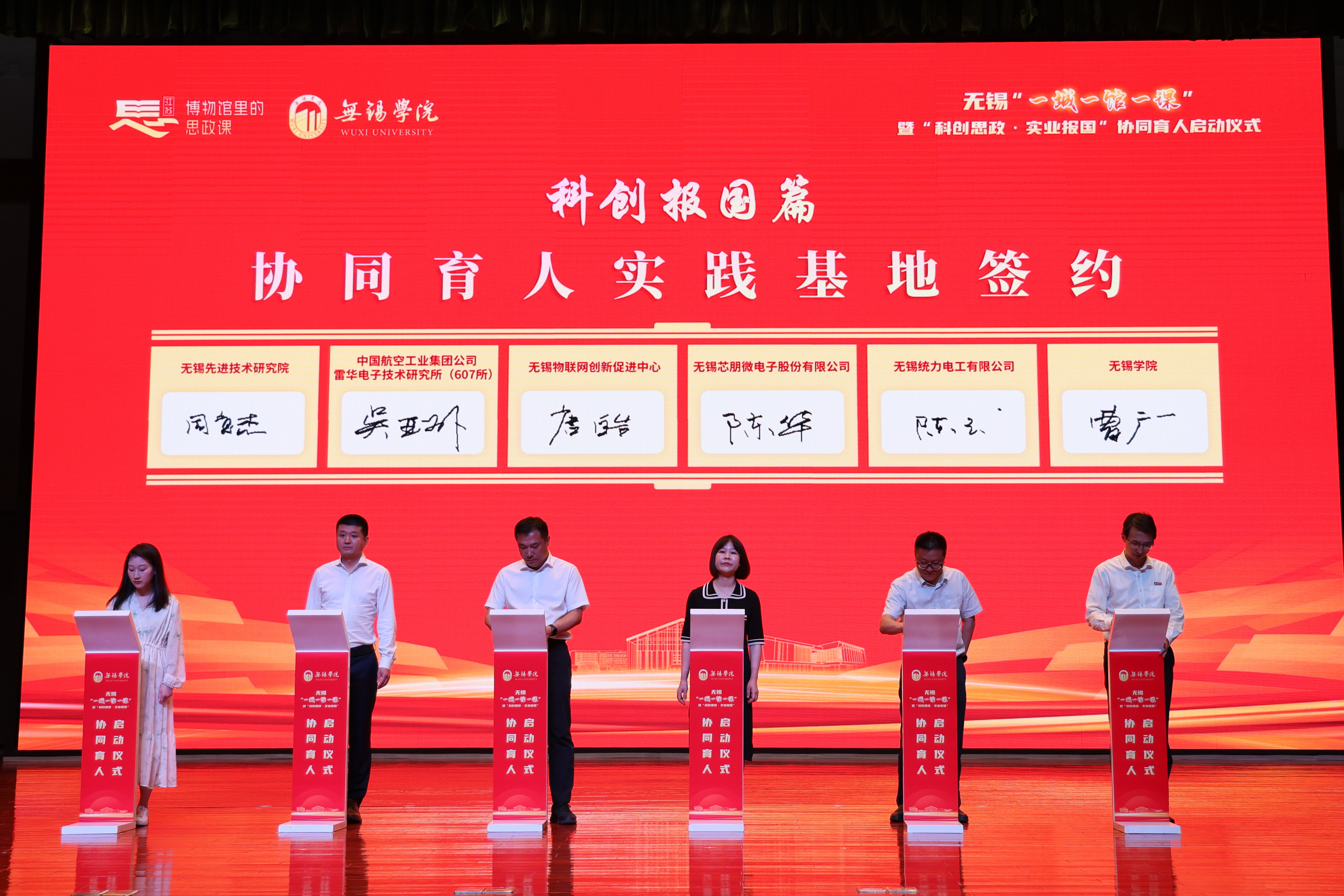 现场发布了首批“红色寻根篇”“科创报国篇”“科学家精神篇”“劳模工匠篇”四大主题20项科创思政精品课程目录。校领导分别与姚桐斌故居纪念馆、严家桥唐苑、新四军六师师部旧址纪念馆、秦邦宪故居、无锡中国民族工商业博物馆、无锡先进技术研究院、雷华电子技术研究所、无锡物联网创新促进中心、无锡芯朋微电子股份有限公司、无锡统力电工有限公司、国家超级计算无锡中心、中国船舶科学研究中心、华中科技大学无锡研究院、中国电子科技集团公司第五十八研究所、公安部交通管理科学研究所、国网无锡供电公司、无锡高新人才发展集团有限公司、无锡公共交通集团有限公司、无锡华能电缆有限公司、无锡透平叶片有限公司等20家协同育人实践基地签约。活动现场为何光华、袁彩凤、邵坚林、陆伟庆、苏化冰等20位“科创思政”导师颁发了聘书。