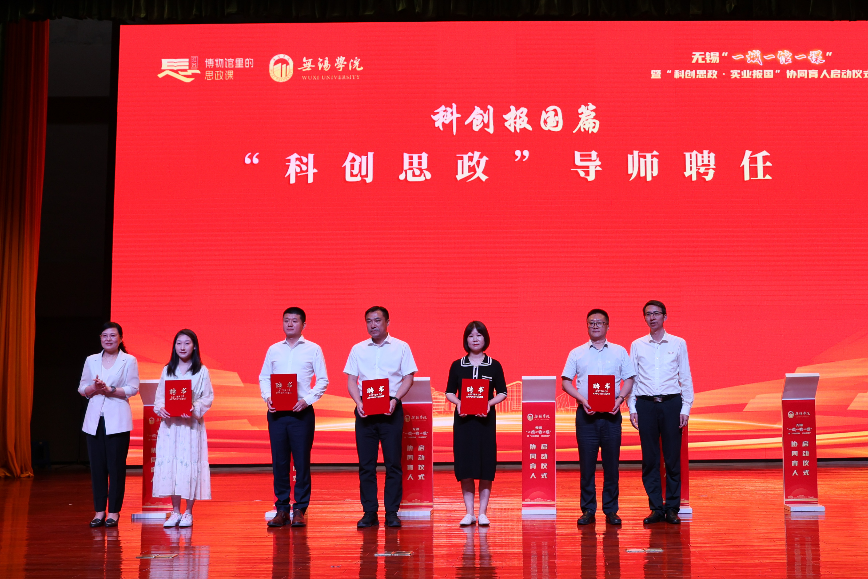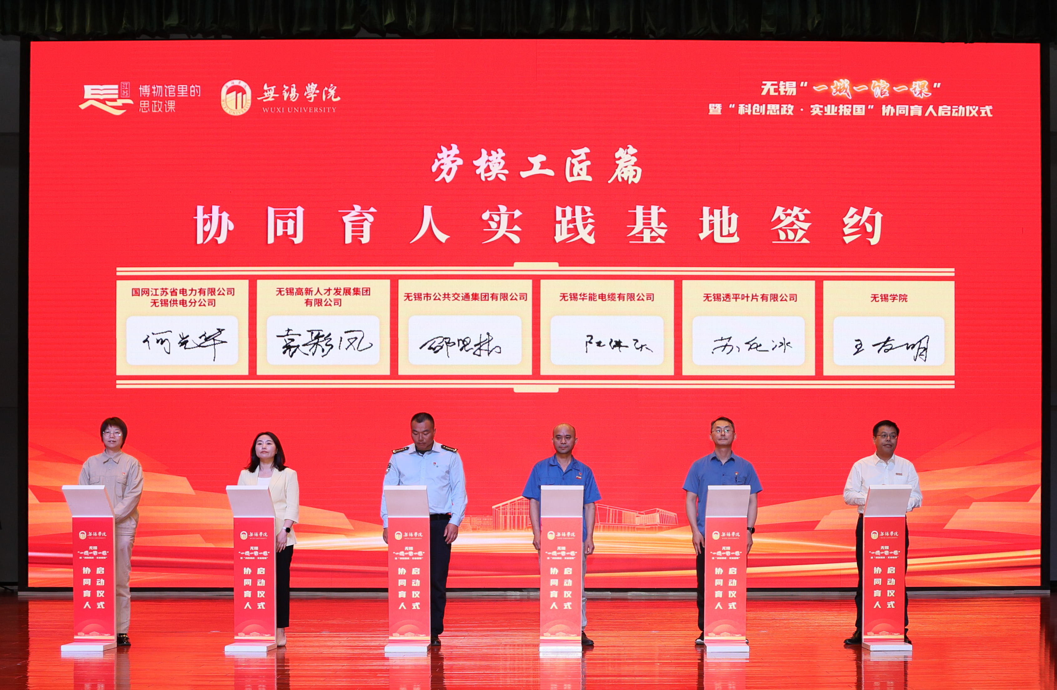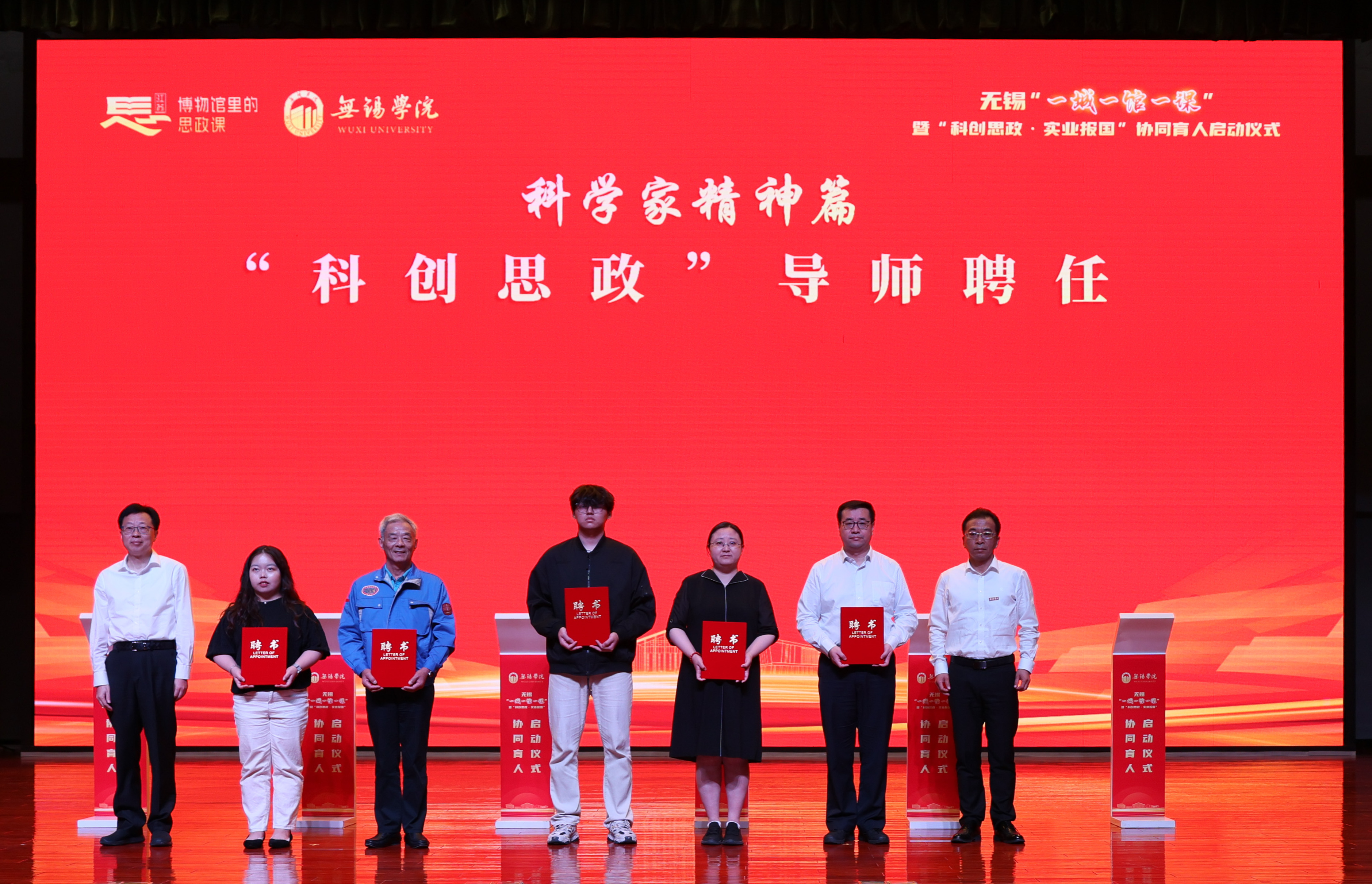 现场发布了首批“红色寻根篇”“科创报国篇”“科学家精神篇”“劳模工匠篇”四大主题20项科创思政精品课程目录。校领导分别与姚桐斌故居纪念馆、严家桥唐苑、新四军六师师部旧址纪念馆、秦邦宪故居、无锡中国民族工商业博物馆、无锡先进技术研究院、雷华电子技术研究所、无锡物联网创新促进中心、无锡芯朋微电子股份有限公司、无锡统力电工有限公司、国家超级计算无锡中心、中国船舶科学研究中心、华中科技大学无锡研究院、中国电子科技集团公司第五十八研究所、公安部交通管理科学研究所、国网无锡供电公司、无锡高新人才发展集团有限公司、无锡公共交通集团有限公司、无锡华能电缆有限公司、无锡透平叶片有限公司等20家协同育人实践基地签约。活动现场为何光华、袁彩凤、邵坚林、陆伟庆、苏化冰等20位“科创思政”导师颁发了聘书。