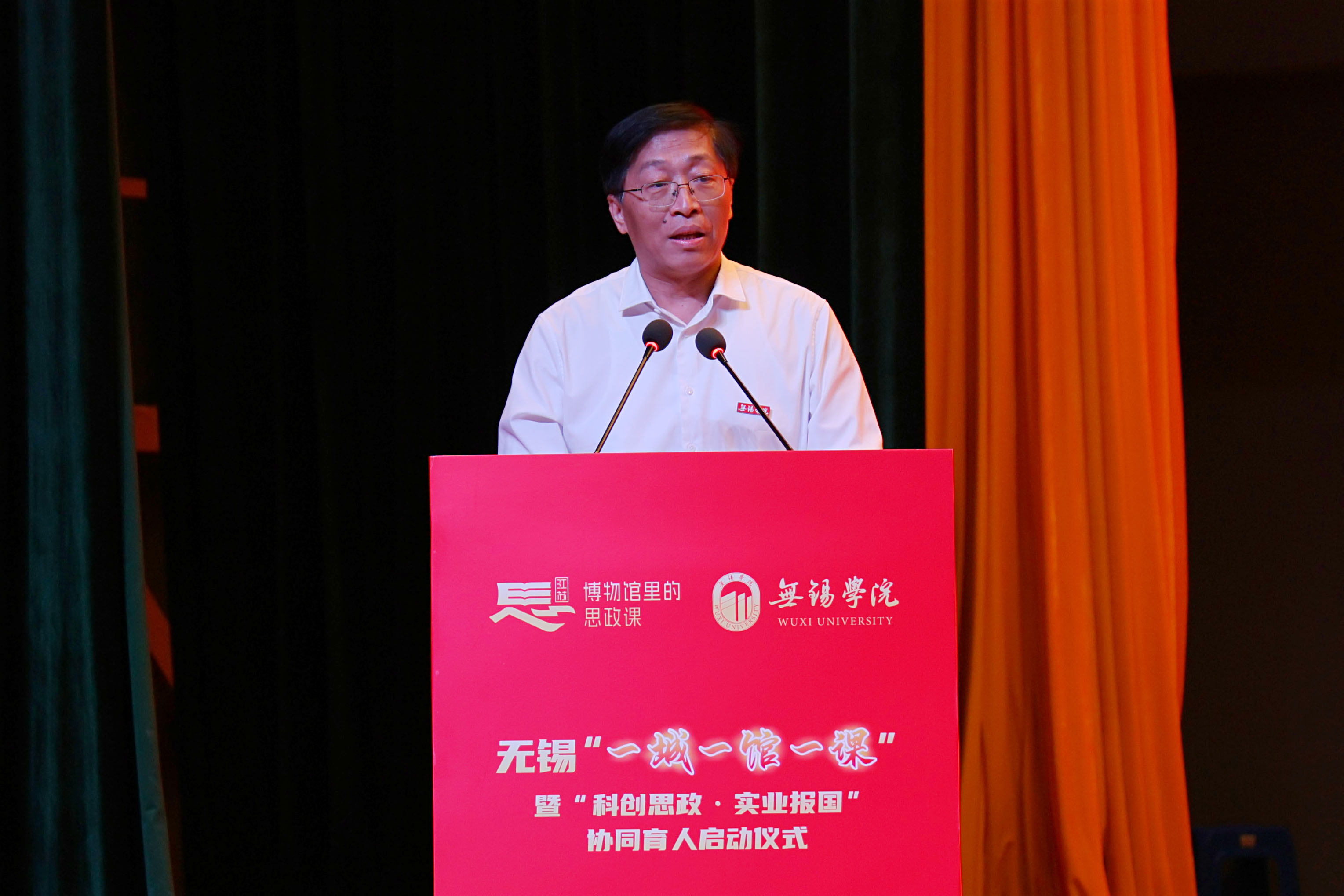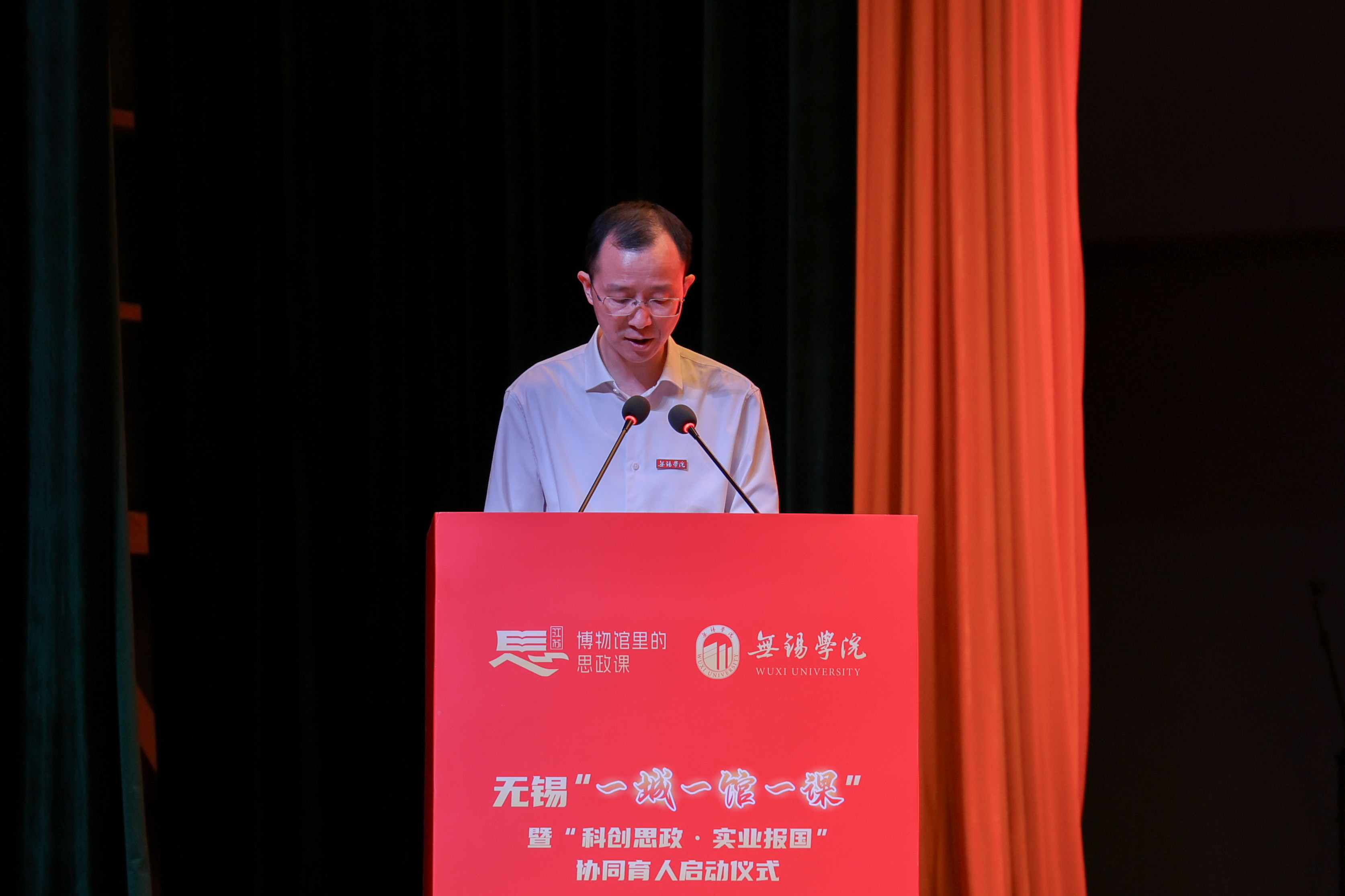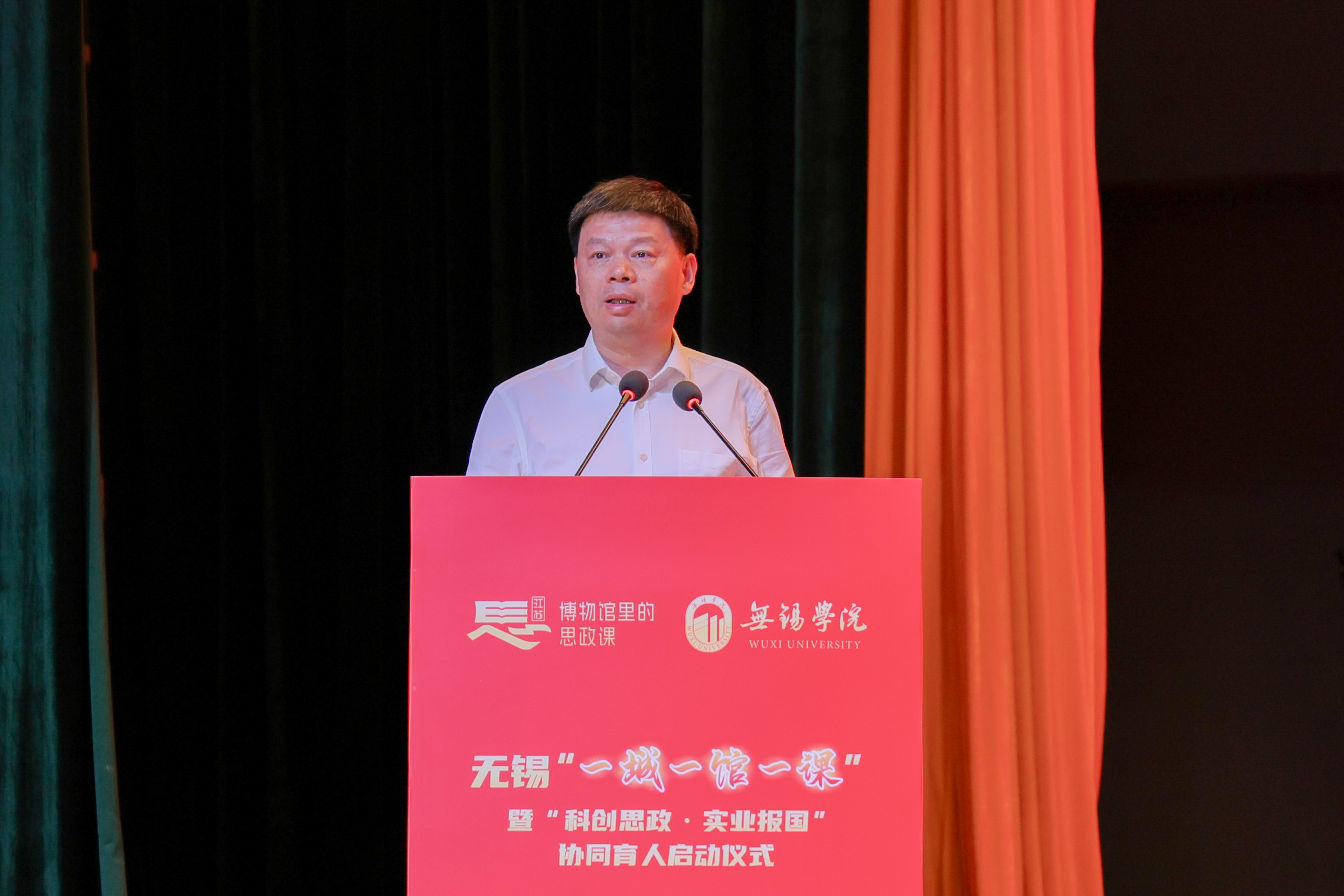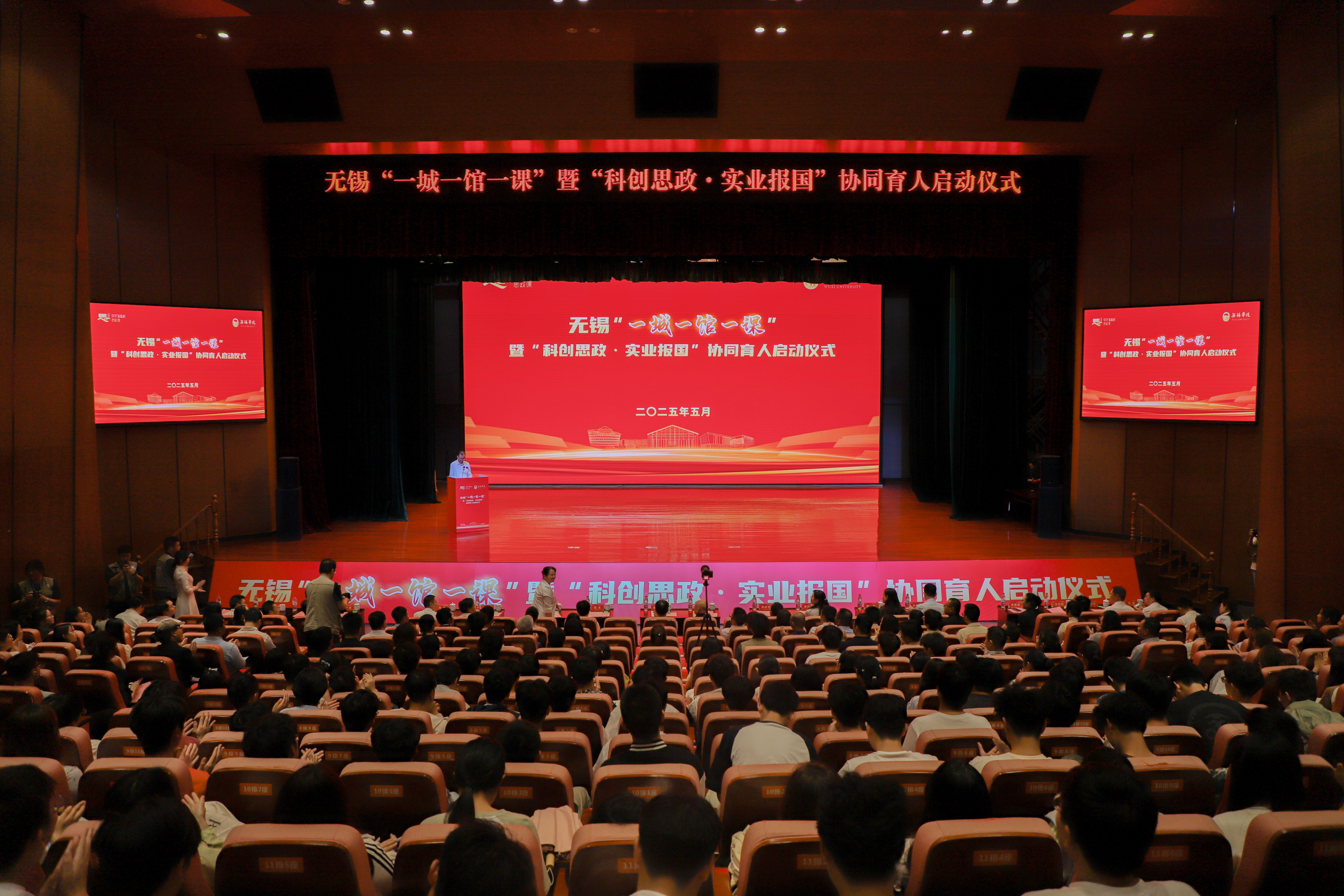 5月16日下午,无锡“一城一馆一课”暨“科创思政·实业报国”协同育人启动仪式在我校大礼堂二楼报告厅隆重举行。江苏省教育厅二级巡视员张鲤鲤,无锡市委常委、宣传部部长李秋峰,中国电子科技集团第五十八研究所所长、国家卓越工程师蔡树军,市委教育工委书记范良,市科协党组书记黄丽侠,市委宣传部副部长高燕,市总工会副主席陈一方,全国劳动模范何光华、袁彩凤、邵坚林、陆伟庆,无锡市劳动模范苏化冰,全市有关红色展馆、科研机构、龙头企业、劳模工匠代表、大中小院校代表,以及我校全体校领导、相关职能部门负责人和学生骨干共同见证了这一深化产教融合、创新思政育人模式的重要节点。启动仪式由校党委副书记匡辉主持。