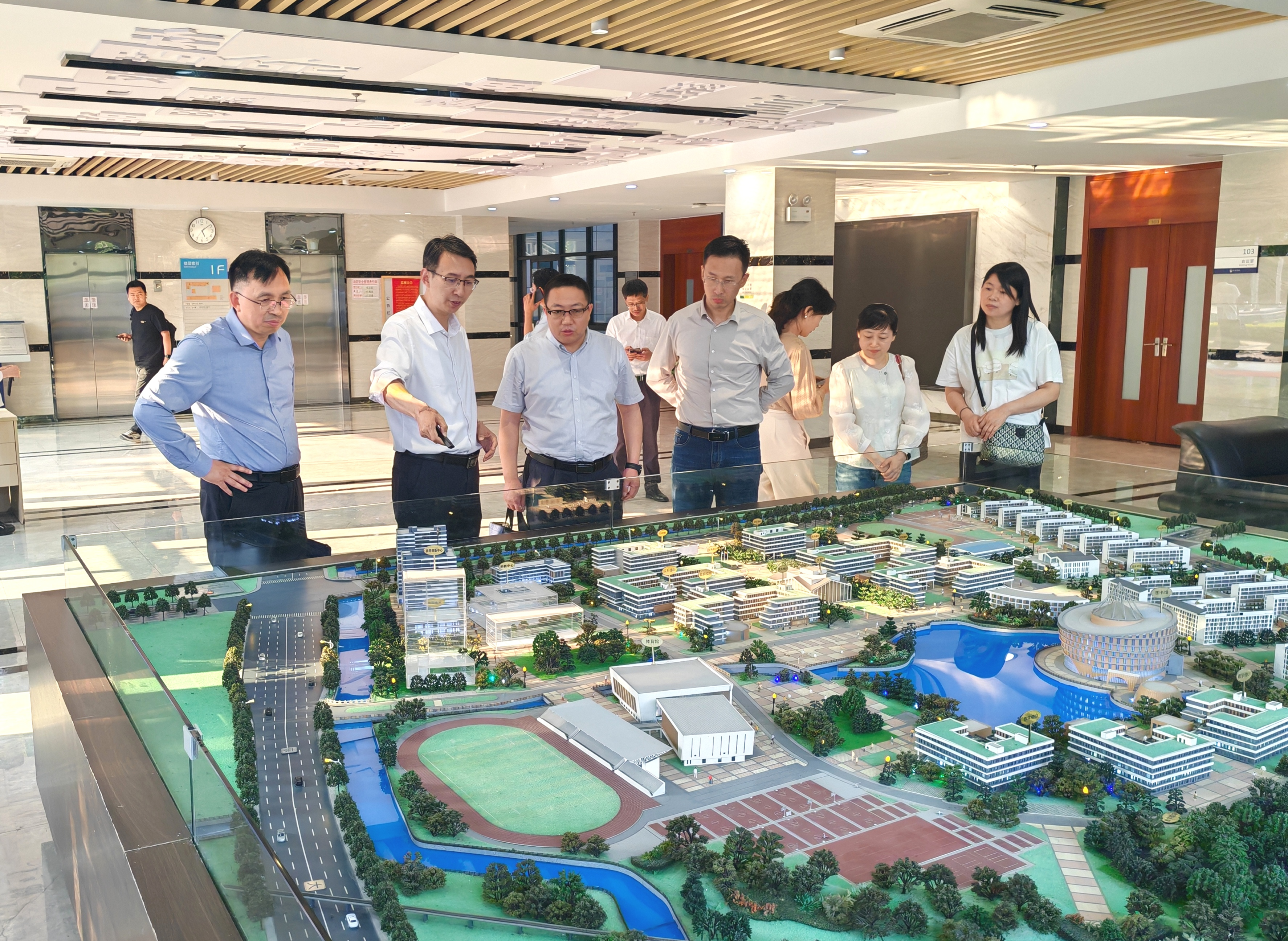 会后,朱竹青一行参观了学校沙盘,曹广喜陪同参观。