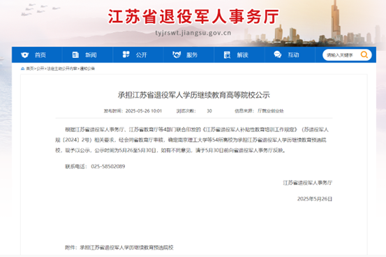 近日,江苏省教育厅、退役军人事务厅联合发布资质认定名单,无锡学院正式成为江苏省退役军人学历继续教育承担高校之一。此次认定依据《江苏省退役军人补贴性教育培训工作规定》(苏退役军人规〔2024〕2号),经院校申报、省级审核及公示签约等流程确定,标志着我校在服务国家战略人才培养方面取得新突破。
