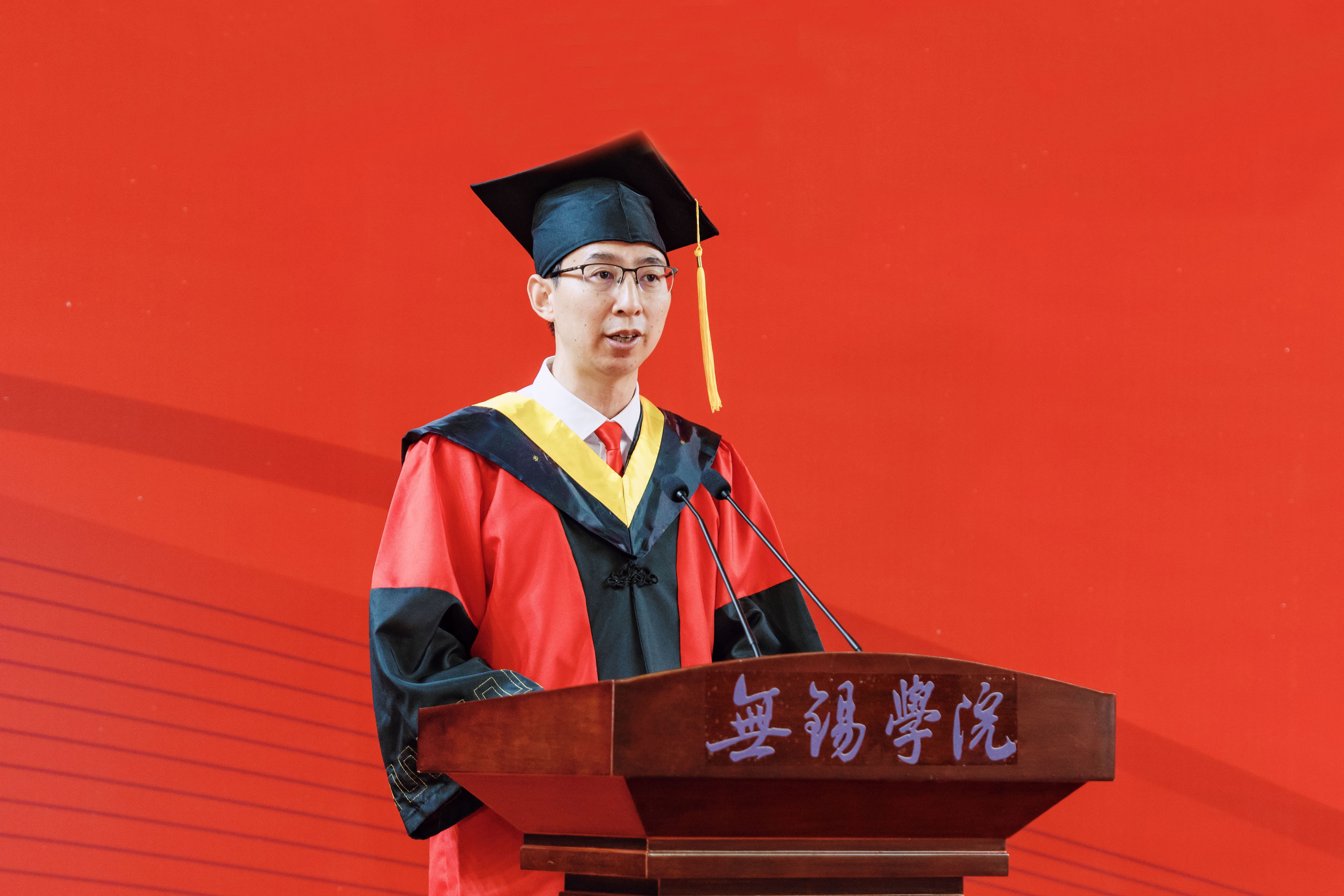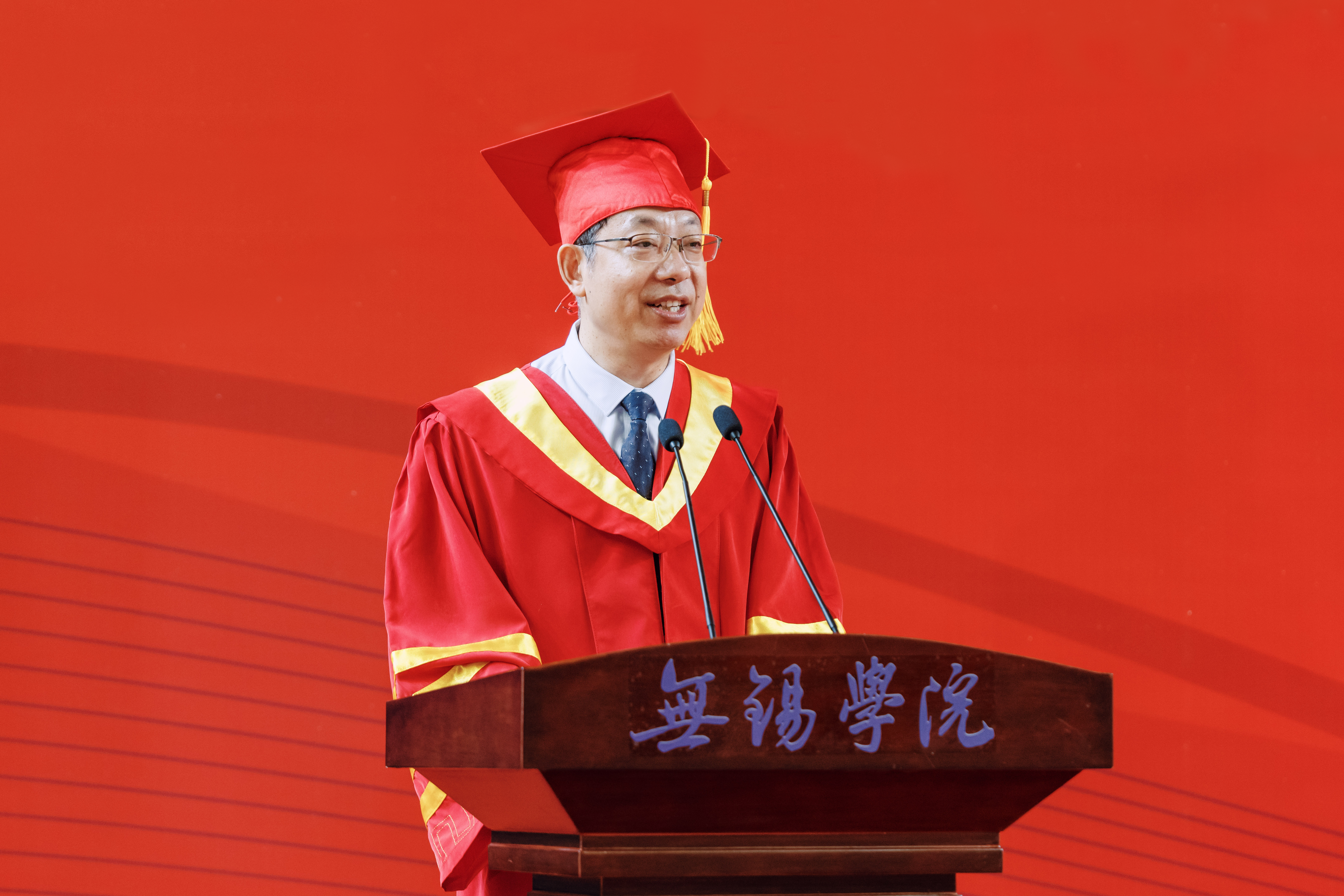 典礼在庄严的国歌声中拉开帷幕。校长孙雁飞以《初心如炬照前路薪火相传励后人》为题寄语毕业学子。他代表学校向2025届全体毕业生表示热烈祝贺,并以三个“一”作为临别赠言勉励即将踏上全新征途的同学们:一是满怀一腔报国志,做勇于担当的追梦者。要感悟“家事国事天下事,事事关心”的责任担当、“崇德厚生、实业报国”的锡商精神,传承和发扬无锡城市浸润的家国情怀。无论身处何方、身在何岗,要始终胸怀“国之大者”,将个人理想融入国家发展大局,让爱国担当成为无锡学院人最鲜明的精神标识。二是铆足一股实干劲,做笃行不倦的奋斗者。要融汇无锡“经世致用”的实干精神和“敢为人先”的创新基因,超越自我、创新突破,与时代发展同向前行,让凌云壮志扎根实践沃土,使远大理想照进奋斗日常,争做新时代的先锋闯将。三是守住一颗从容心,做自己人生的掌舵者。要培养强健的体魄和坚韧的意志,学会以宁静豁达的人生智慧面对新压力和新挑战,在顺境中保持清醒,在逆境中永不言弃,在人生的赛道上跑得更稳、更远、更精彩,让自己的人生更有高度、更有境界、更有品位。