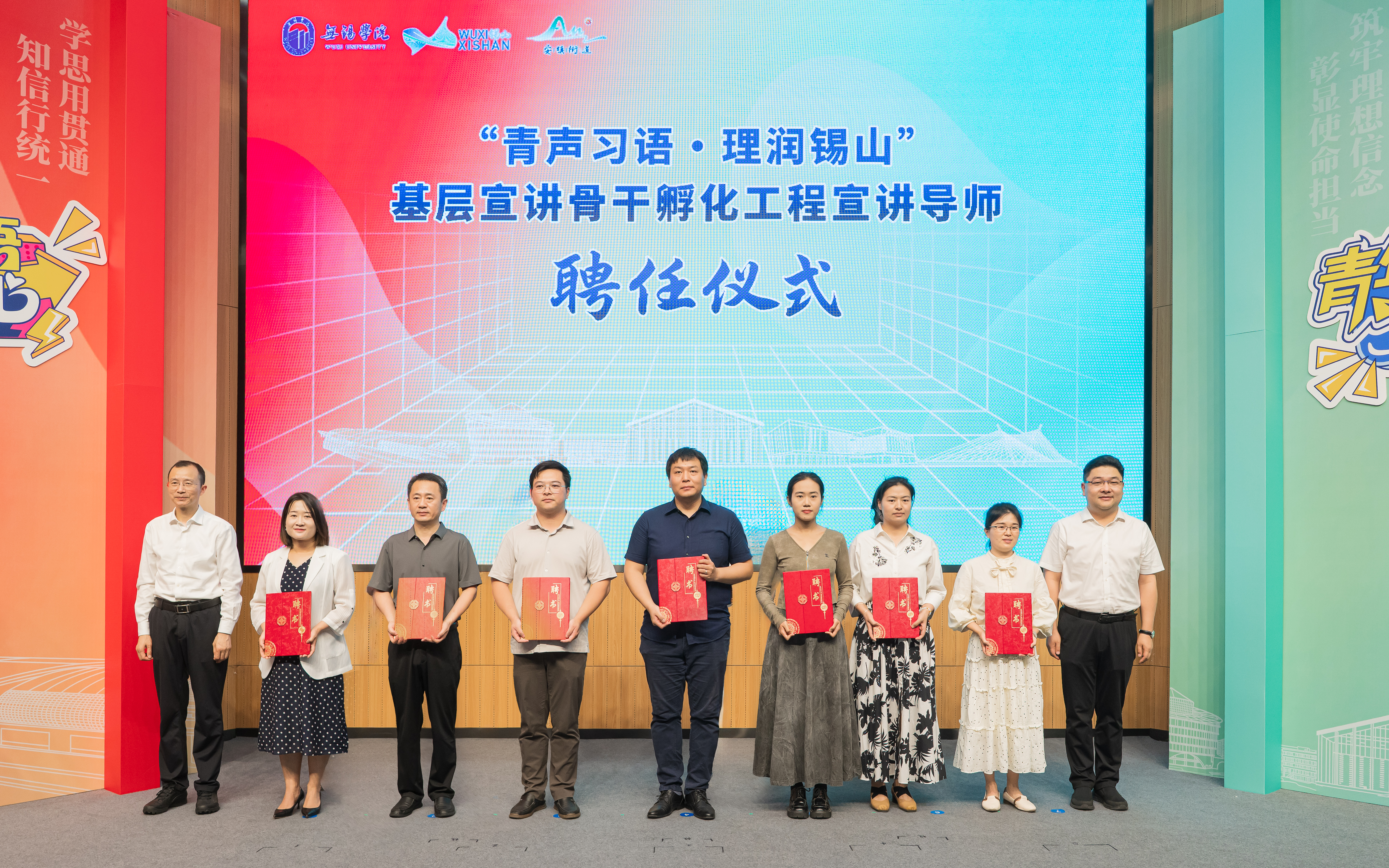 校党委副书记匡辉、区委宣传部常务副部长周品飞为“青宣工程”宣讲导师颁发聘书。陕西延安干部学院讲师、延安市社科青年学者、挂职中共无锡市委党校教务处副处长张湘芬受聘为特邀导师、来自无锡市“理响无锡”宣讲大联盟的8位成员受聘成为宣讲导师。
