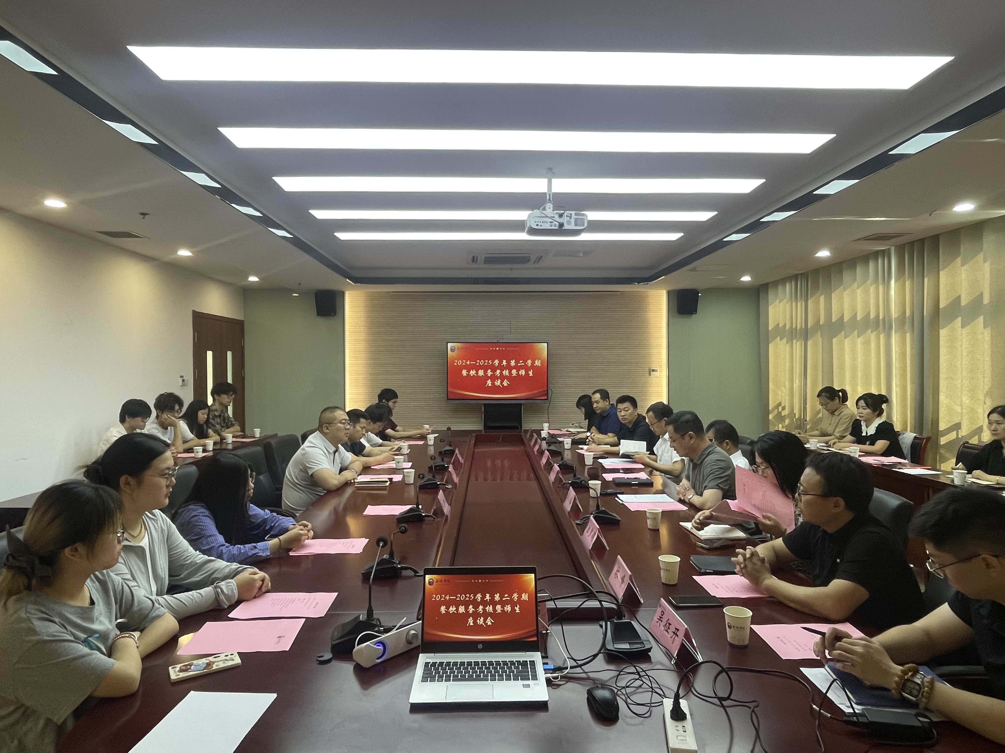 6月27日上午,我校后勤管理处在行政楼301会议室举行2024-2025学年第二学期餐饮服务考核暨师生座谈会。副校长胡剑凌,后勤管理处处长李小睿,餐饮管理科全体人员,师生代表及各餐饮公司负责人及员工代表参加会议。本次会议旨在总结学期餐饮工作,通报考核结果,倾听师生心声,评选“最受欢迎餐厅”。