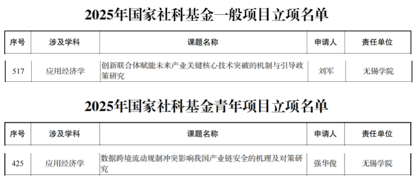 9月5日,全国哲学社会科学工作办公室公布了2025年国家社会科学基金年度项目立项名单,我校共有2个项目获批立项。其中,数字经济与管理学院刘军院长获批一般项目1项,强华俊老师获批青年项目1项。这是我校首次获批国家社会科学基金一般项目。