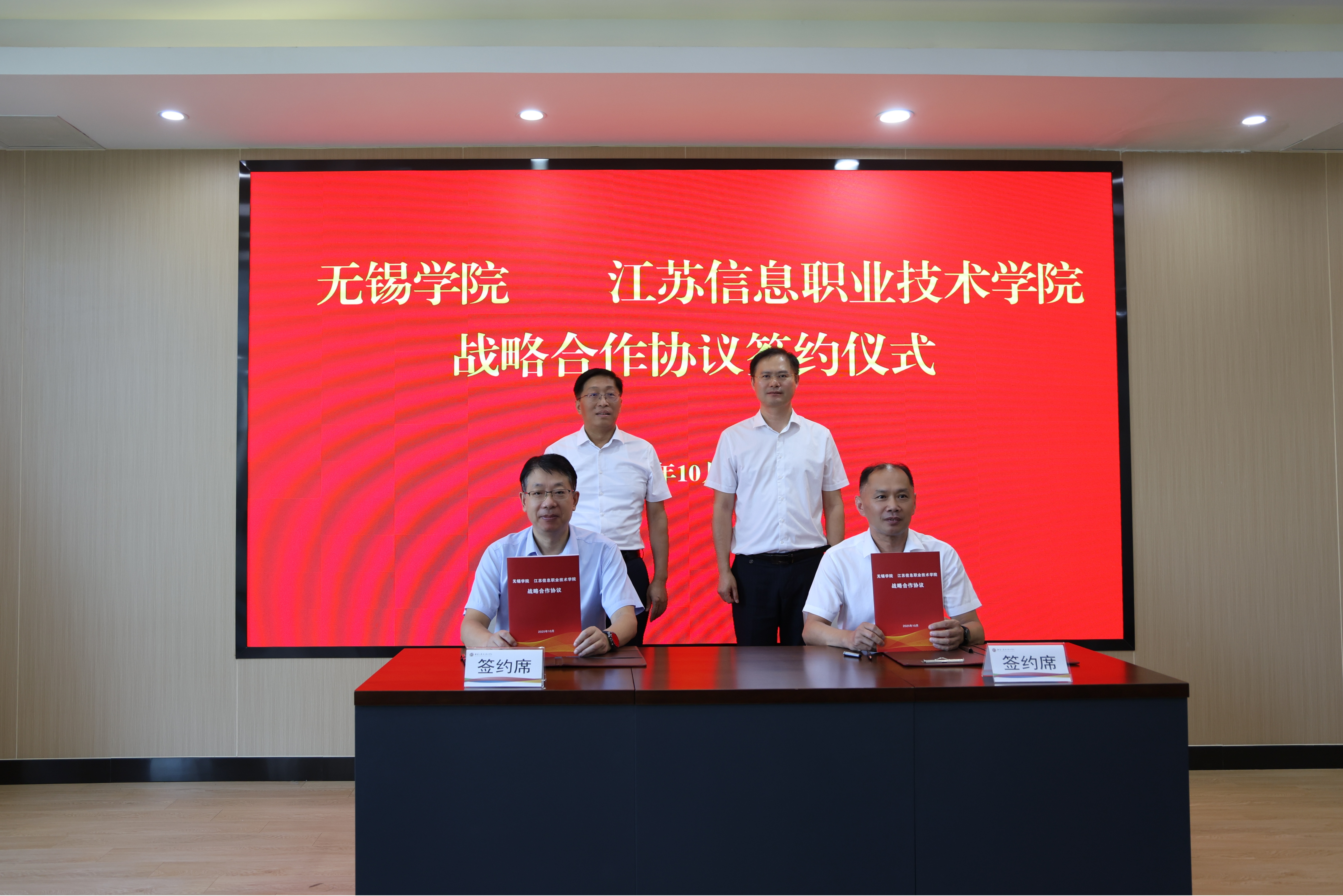 10月11日上午,我校与江苏信息职业技术学院举行战略合作协议签署仪式。校党委书记张永宏,校长孙雁飞,副校长梁惠娥、曹广喜,纪委书记王友明,副校长徐军海、韩建刚,江苏信息职业技术学院党委书记左同宇,校长张瑜,党委副书记孙萍,纪委书记刘文平,副校长徐振邦、宋丽娜,副校长、党委组织部部长孟庆东等出席活动。