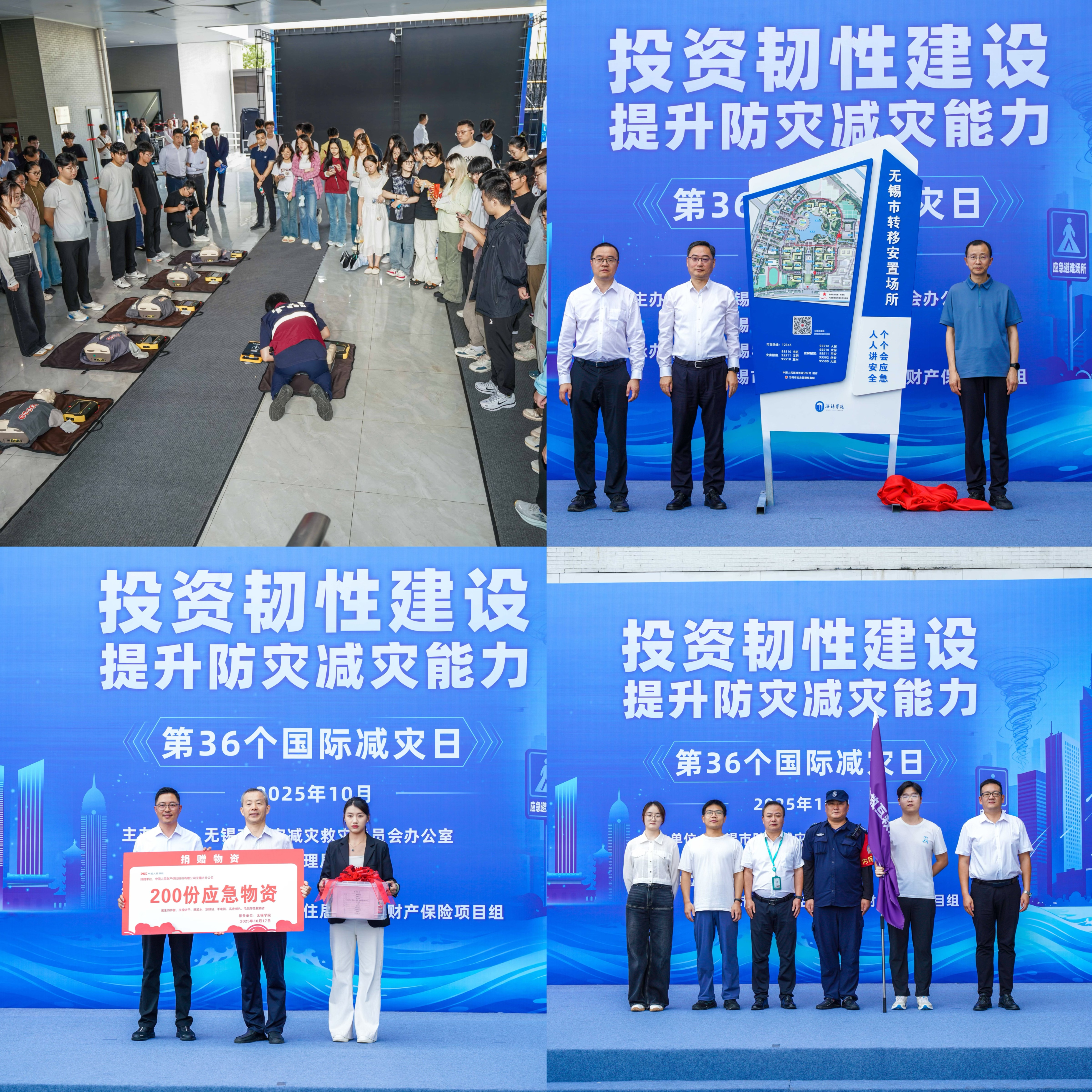 10月17日,在第36个“国际减灾日”主题宣传活动期间,由无锡市防灾减灾救灾委员会办公室、无锡市应急管理局主办,无锡学院与无锡市城乡常住居民住房财产保险项目组联合承办的“投资韧性建设,提升防灾减灾能力”主题宣传活动在我校体育馆前广场顺利举行。我校党委副书记匡辉,无锡市防灾减灾救灾委员会办公室副主任、市应急管理局党委委员、副局长朱弘成,人保财险无锡市分公司党委委员、总经理助理陈惟等出席活动。数字经济与管理学院、应急管理学院院长刘军,校团委副书记费鹏程,保卫处副处长陈翀,应急管理学院副院长邹衍华及师生代表百余人参加活动。