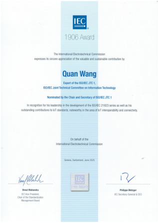 近日,国际电工委员会(IEC)2025年度1906奖评选结果揭晓。经ISO/IEC JTC 1/SC 41(国际物联网与数字孪生分技术委员会,以下简称“SC41”)主席和秘书处推荐,我校物联网工程学院王泉教授获得该奖项,也是本年度全国物联网领域唯一获此奖项的专家。