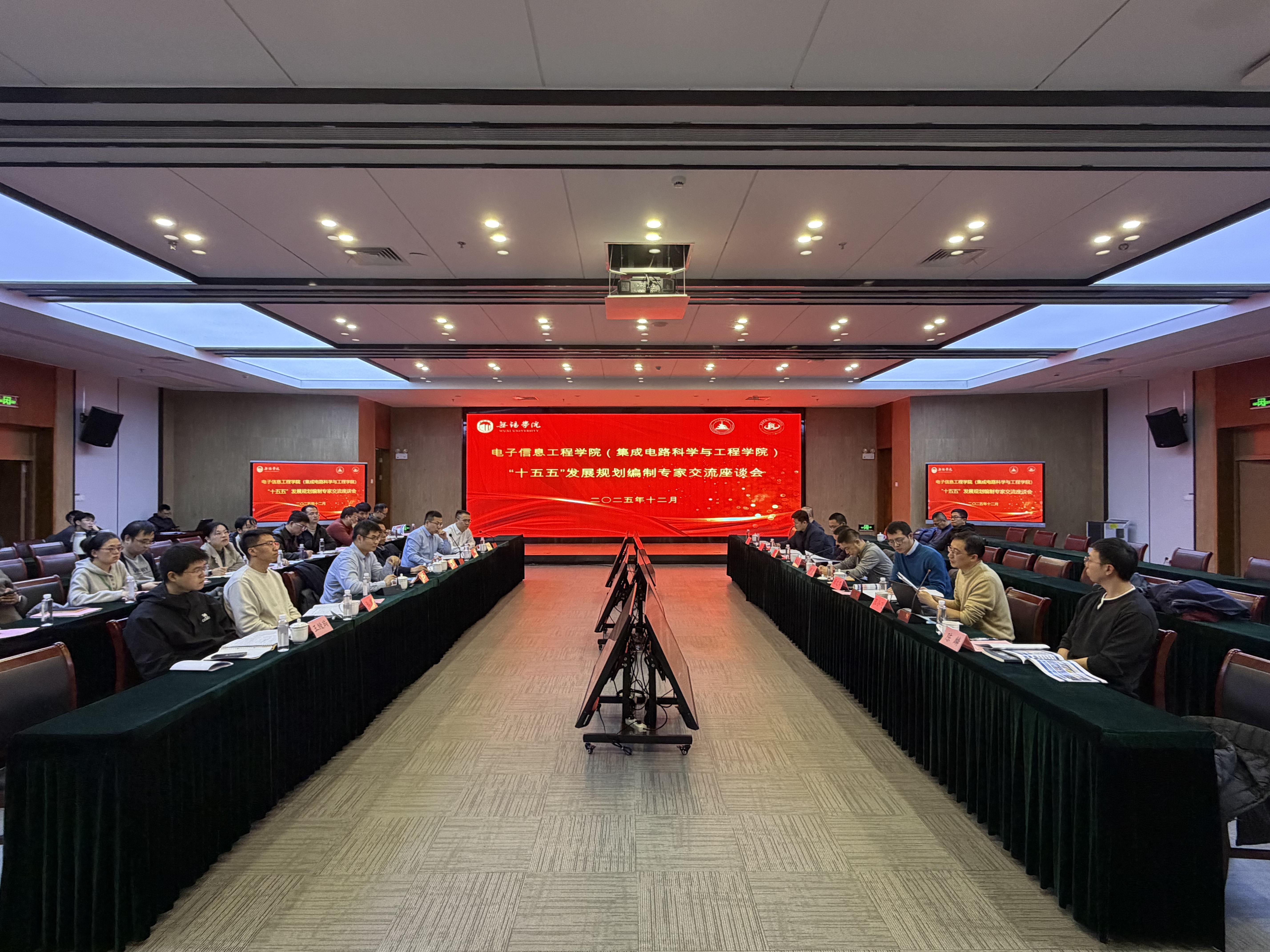 为精准擘画学院“十五五”发展蓝图、夯实高质量发展根基,12月3日下午,电子信息工程学院(集成电路科学与工程学院)(以下简称“电信院”)组织召开“十五五”发展规划编制专家交流座谈会。邀请中航雷达与电子设备研究院(607所)副总工程师、集团公司特级技术专家鄢学全,南京理工大学微电子学院(集成电路学院)党委副书记、执行院长顾文华,苏州工学院电子信息工程学院院长张惠国,南京航空航天大学电子信息学院副院长张小飞,南京信息工程大学长望学院副院长常建华,无锡市工业和信息化局电子信息产业处处长缪晟,芯慧联半导体科技有限公司董事长刘红军等专家出席会议。我校副校长胡剑凌出席会议,发展规划处处长齐运锋、电信院领导班子及学院“十五五”规划编写小组成员参加会议。
