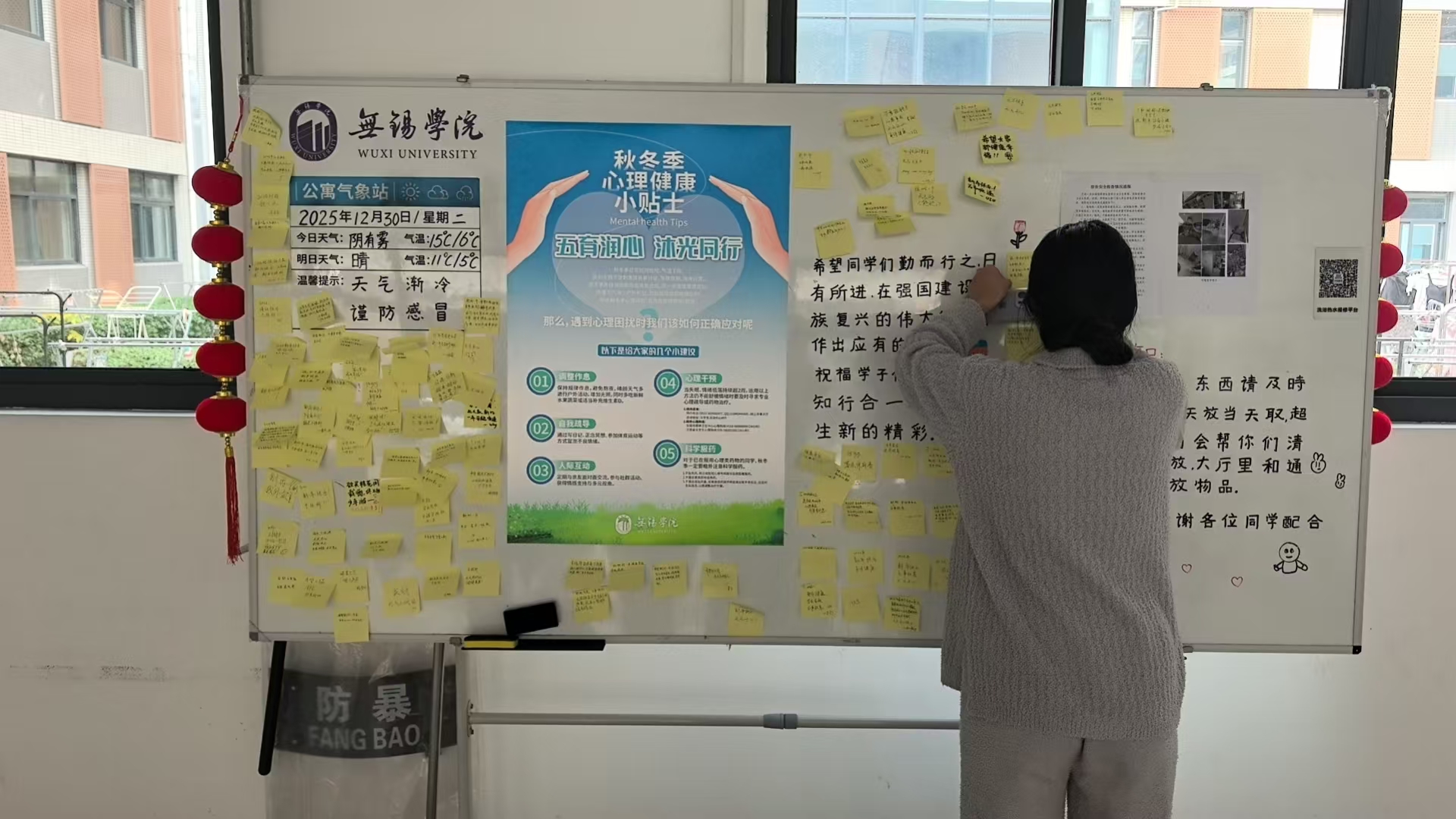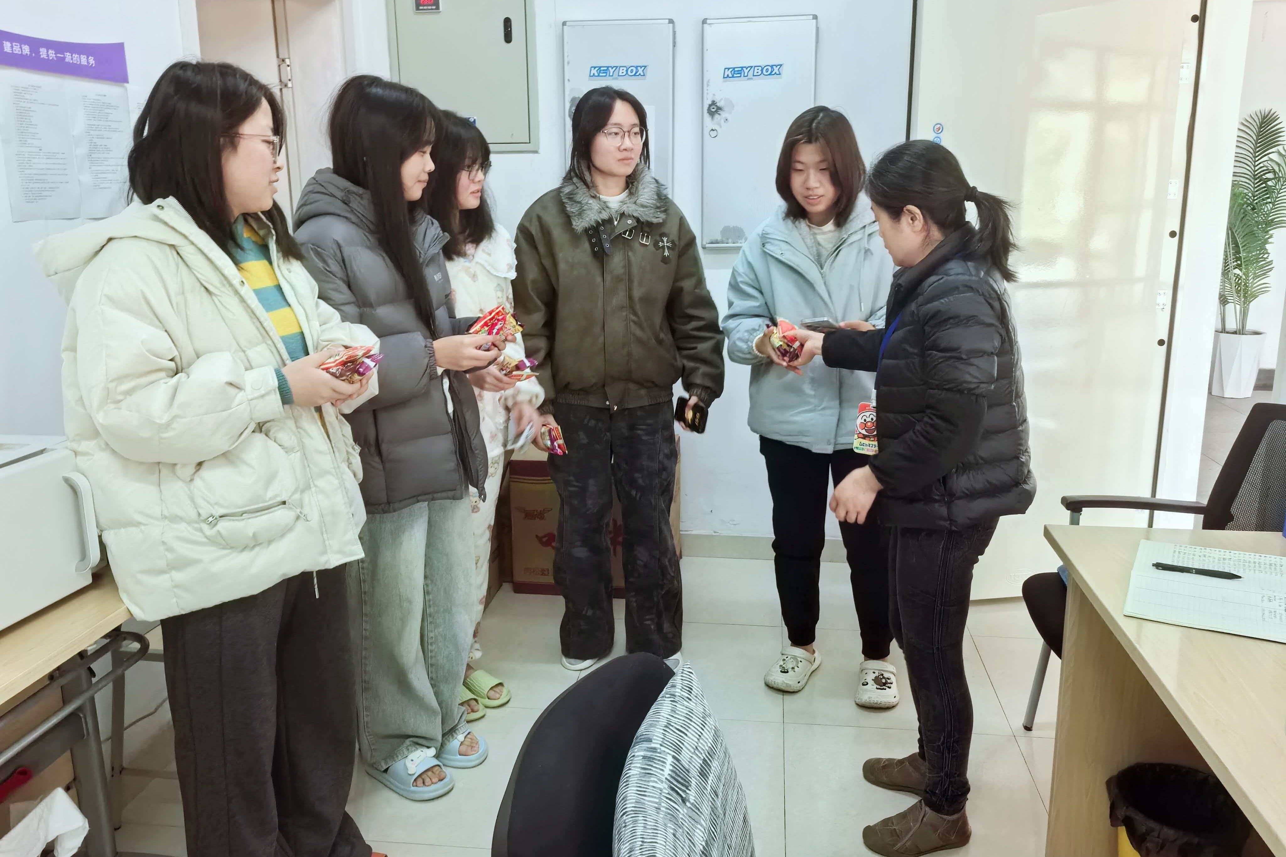 各活动现场掌声热烈、欢笑阵阵,师生们都洋溢着迎接新年的喜悦。在主题抽奖环节,抽奖嘉宾逐一抽取幸运学子,并将一份份承载着心意与关怀的暖心礼品——保温杯、玩偶抱枕、加绒三件套等送到同学们手中。为深化价值引领,活动精心设置了“答题赢礼”线上答题环节。题目紧扣学校校史、校风校训、宿舍安全规范等与校园生活密切相关的内容,有效激发了参与热情,吸引了众多学子答题。“寄语互动”环节汇聚了同学们对新年的憧憬、对学业的期盼、对校园的祝福,亲笔写下的一张张便签贴成了“元旦寄语墙”,成为宿舍楼内一道温暖而亮丽的风景。