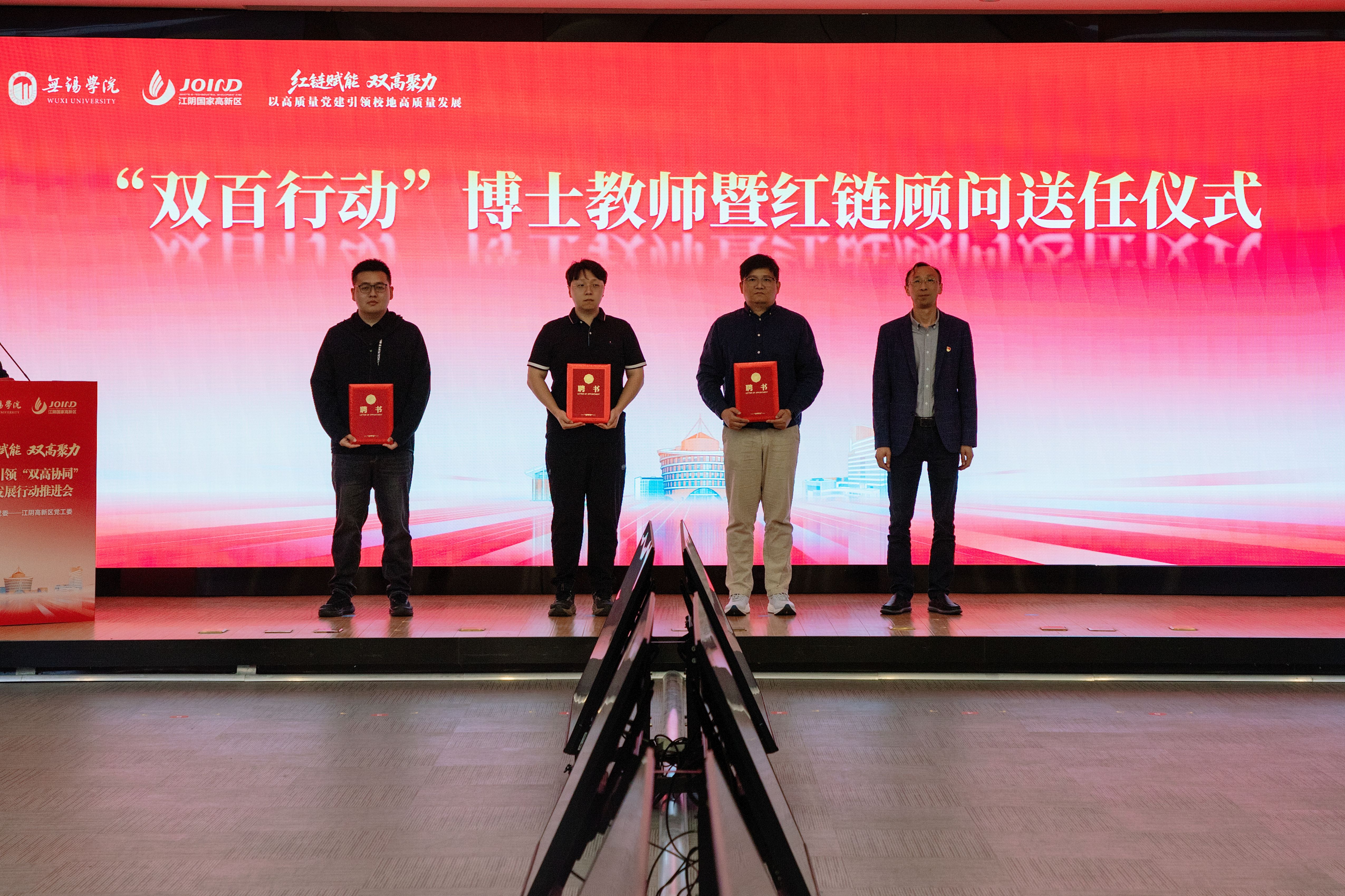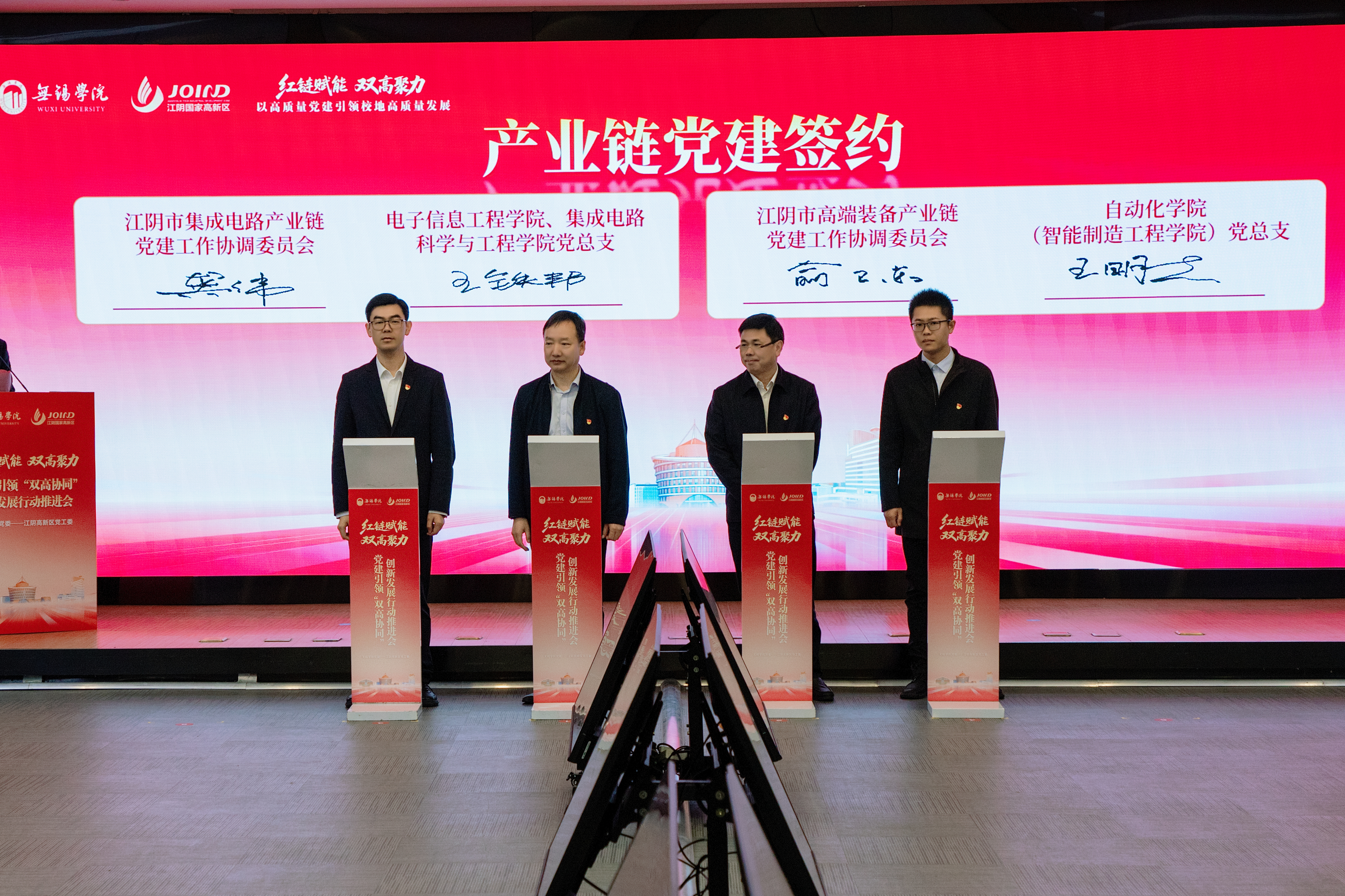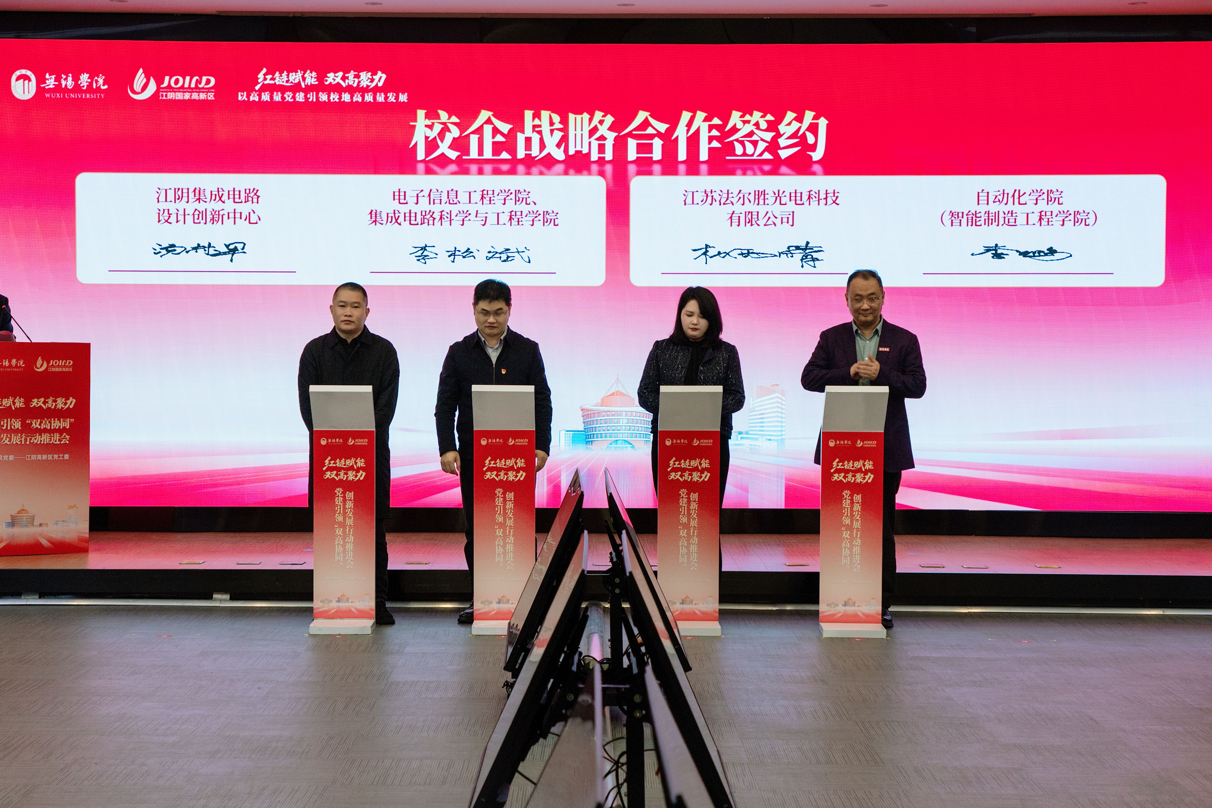 会上举行了共建签约、基地揭牌、聘书授予等活动。江阴市集成电路、高端装备产业链党建工作协调委员会分别与我校电子信息工程学院、自动化学院党总支签约共建;江阴集成电路设计创新中心、江苏法尔胜光电科技与我校签订校企战略合作协议。技术经理人学院江阴高新区培训基地、无锡学院技术转移中心江阴分中心正式揭牌。一批企业专家受聘为我校产业教授,“双百行动”博士教师暨红链顾问现场接受送任。与会领导共同启动无锡学院党委—江阴高新区党工委“红链赋能·双高聚力”创新发展行动。