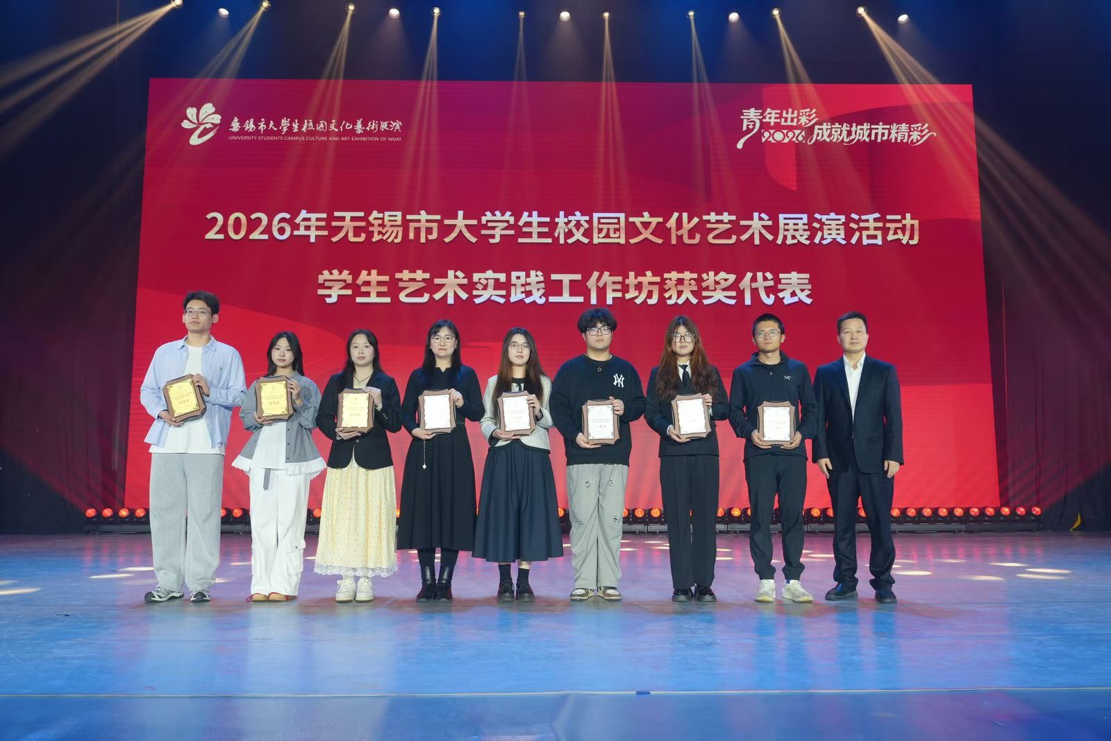 近日,“‘青年出彩’成就‘城市精彩’”——2026年无锡市大学生校园文化艺术展演活动在我校大礼堂圆满落幕。我校副校长韩建刚与无锡市委宣传部、市教育局、市文化广电和旅游局、团市委等主办单位相关领导共同出席颁奖汇演,并为获奖师生代表颁奖。