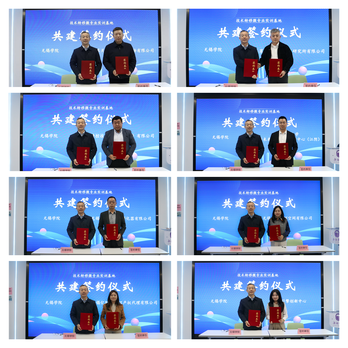 现场发布了第一批实训基地名单,数字经济与管理学院(无锡技术经理人学院)院长刘军,分别与江苏天安智联科技股份有限公司、江苏集萃应用光谱技术研究所有限公司、清控技术转移(无锡)有限公司、无锡市聚能锡创孵化器有限公司、无锡健盟众创空间有限公司、无锡亿联盛知识产权代理有限公司、无锡新引擎创新中心和西安交通大学长三角科技创新中心等共8家实训基地代表现场签约。