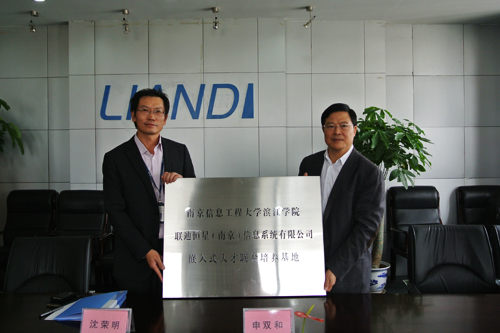 10月22日下午,我院与联迪恒星(南京)信息系统有限公司签约仪式。滨江学院院长申双和、联迪恒星(南京)信息系统有限公司总经理沈荣明就计算就计算机科学与技术(嵌入式培养)代表双方签署了协议。副院长耿焕同、教务办公室主任齐运锋、计算机系系主任刘生、联迪公司人力资源总监高俊、开发部经理刘振华、联迪杰易职业培训学校校长张跃、教学主管张前程参加了签约仪式。