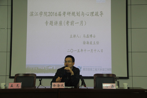 考研愈发临近,是不是时常感觉“压力山大”,焦虑不安?是不是书上的内容总感觉看不完,总会有不会做的题,感觉还有很多东西没背?是不是看到同学们都去找工作了感觉自己坐不住了?为帮助考研同学们更好地规划最后一段时间的复习,以最佳的心理状态走进考场,11月18日晚,滨江学院特邀浙江大学博士、信大卓越考研指导名师、“名校考研俱乐部”策划人、考研辅导、激励与规划专家马磊副教授以及南京信息工程大学心理中心主任徐海波老师,为2016届考研学子作“考前一月考研规划与心理疏导”专题讲座。