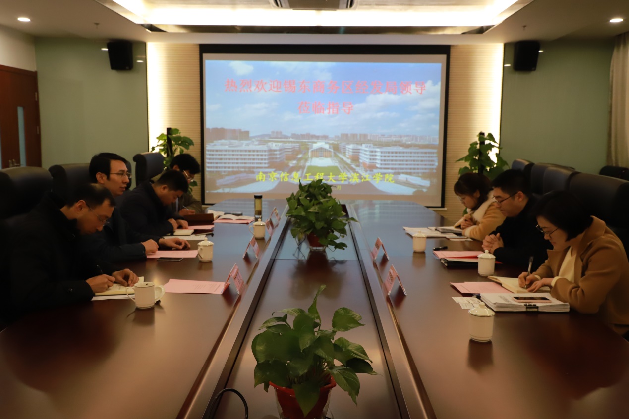 曹广喜院长对锡东商务区经发局领导一行的到来表示热烈欢迎,从滨江学院的专业特色、师资配备、校企深度融合和无锡研究院的发展情况等方面介绍了学院校企合作和人才培养情况。他希望以此次调研交流为契机,进一步加强我院与锡东商务区的合作交流。