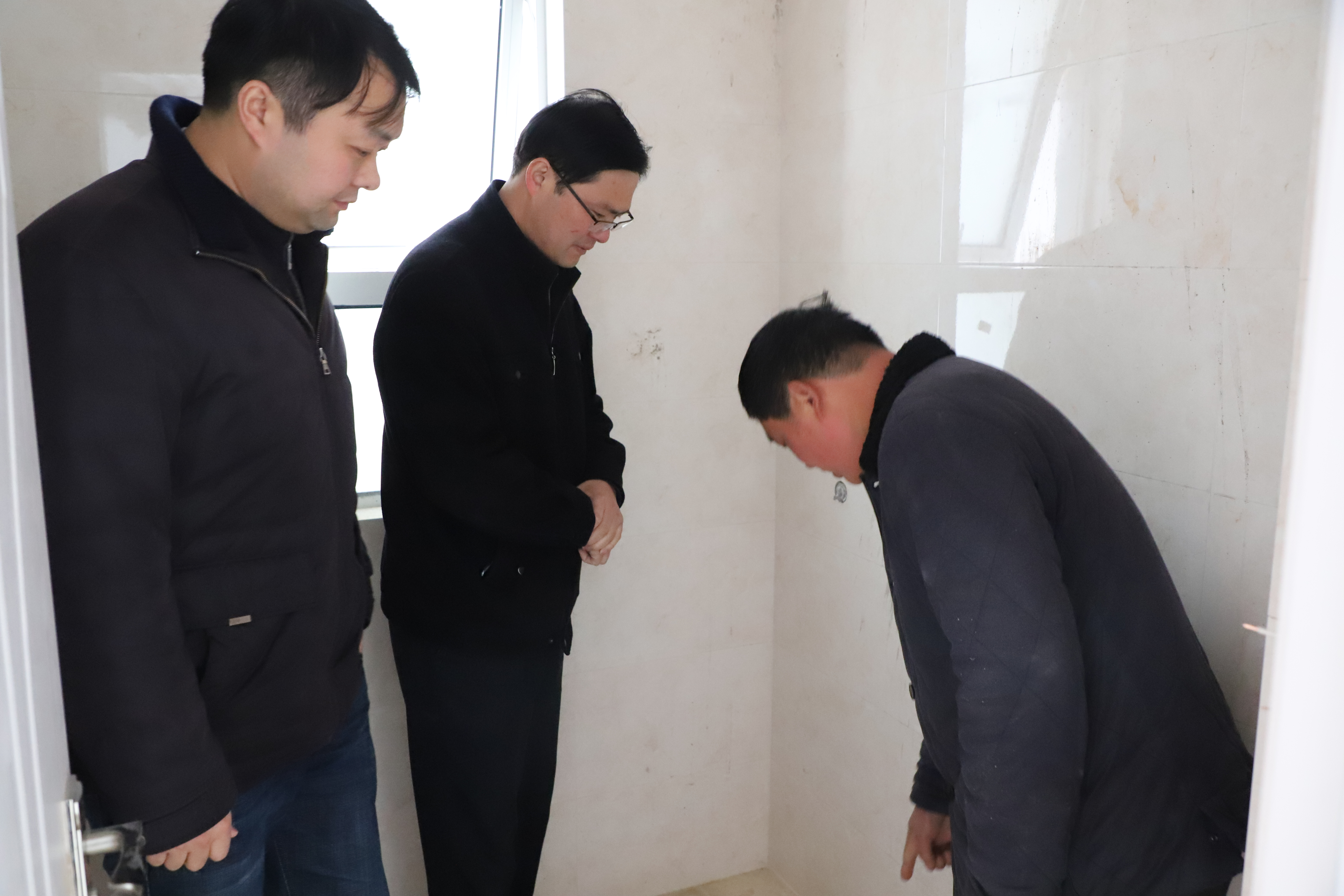 我院代表先后考察了水岸佳苑D区38栋、40栋和29栋房屋装修工程。左同宇书记每到一处都仔细询问施工情况,了解施工进度安排、装修材料来源、房屋空间改造、水电线路布置、吊顶结构改造、背景墙设计等。施工单位负责人和现场技术人员一一作了解答。左同宇书记感谢建设局和施工方为装修工作做出的贡献,希望在后续施工中紧扣节点时间要求,狠抓质量,做到精益求精,切实保障教职工安居乐业。