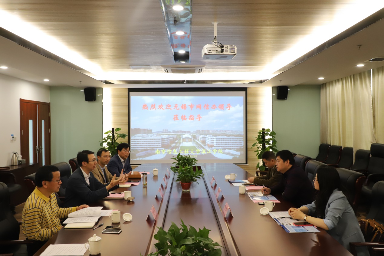 4月23日上午,无锡市委网信办(网络安全和信息化委员会办公室)网络安全处处长孙迎强一行来我院调研交流。院长曹广喜,实验室与设备管理处处长丁留贯,图文信息中心主任安杰,物联网工程学院院长钱承山参加座谈。