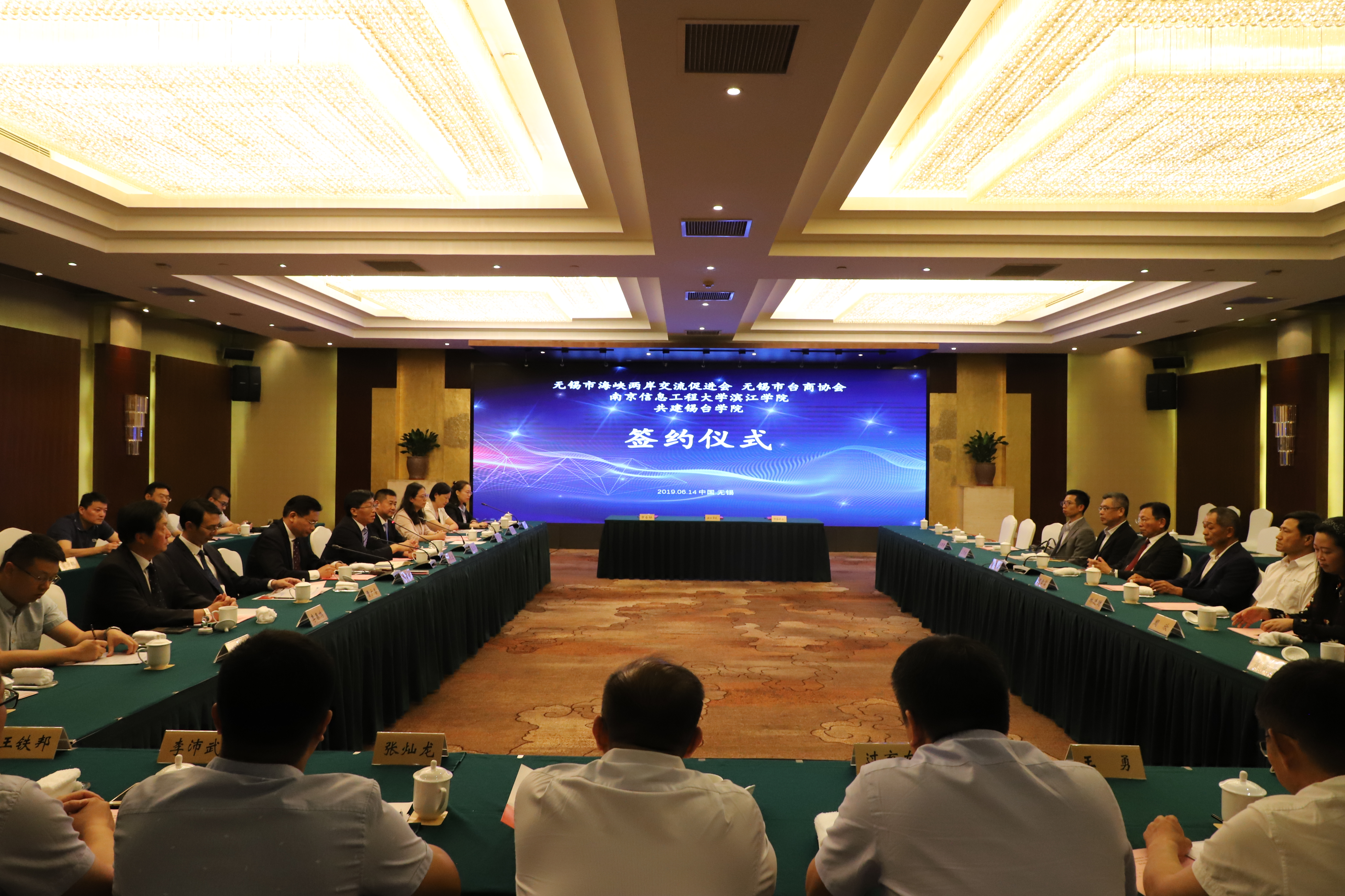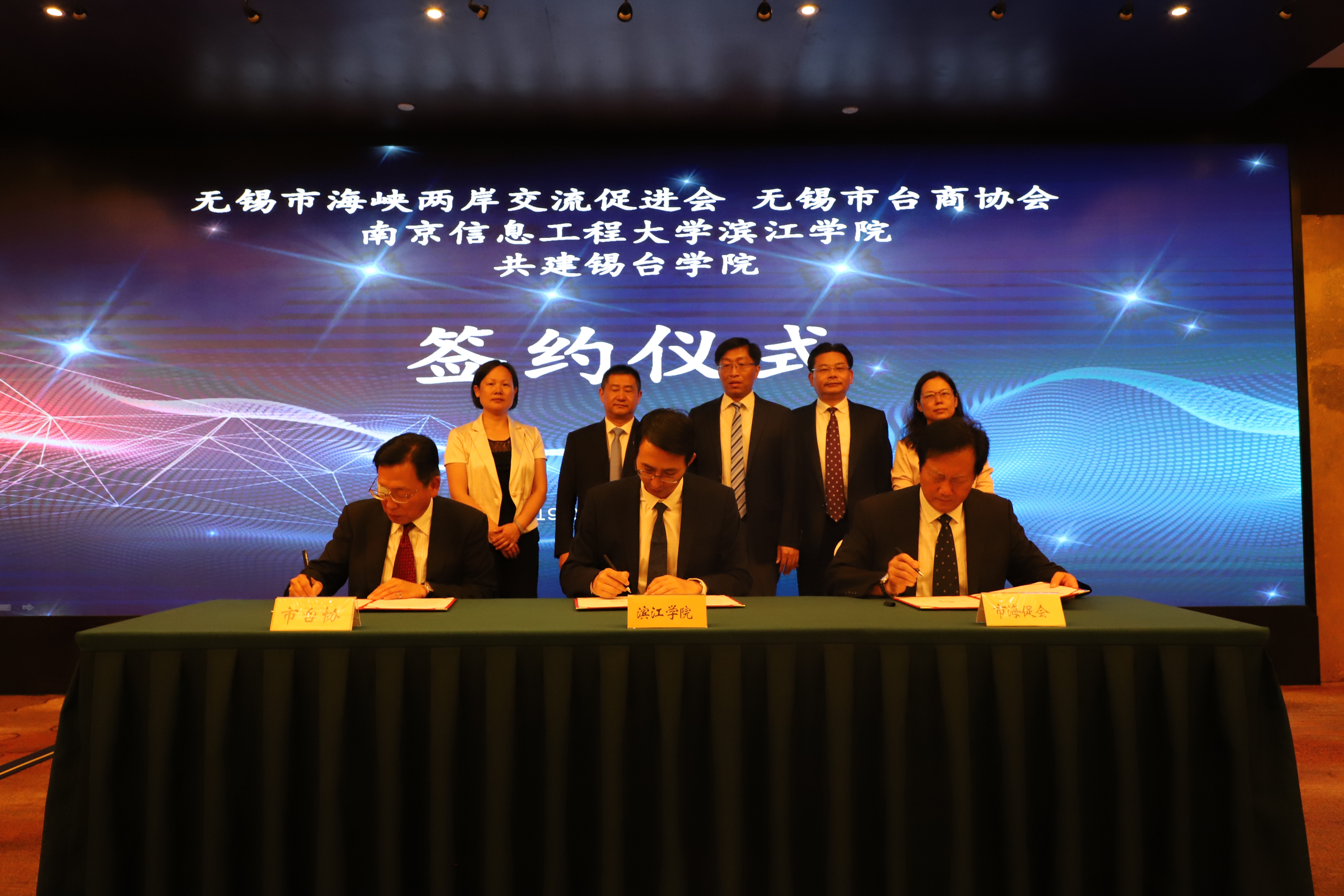 6月14日下午,南京信息工程大学滨江学院、无锡市海峡两岸交流促进会、无锡市台商协会共建锡台学院签约仪式在锡州花园酒店举行。南京信息工程大学副校长张永宏,无锡市台办副主任蔡卫红、无锡市教育局工委副书记、副局长符菊成、锡山区人民政府副区长陈奕、无锡市海峡两岸交流促进会副会长李春鸣、无锡市台商协会副会长陈卓立、锡山区台商联谊会副会长林进财、滨江学院院长曹广喜等相关领导出席签约仪式。本次签约仪式由南京信息工程大学滨江学院主办。