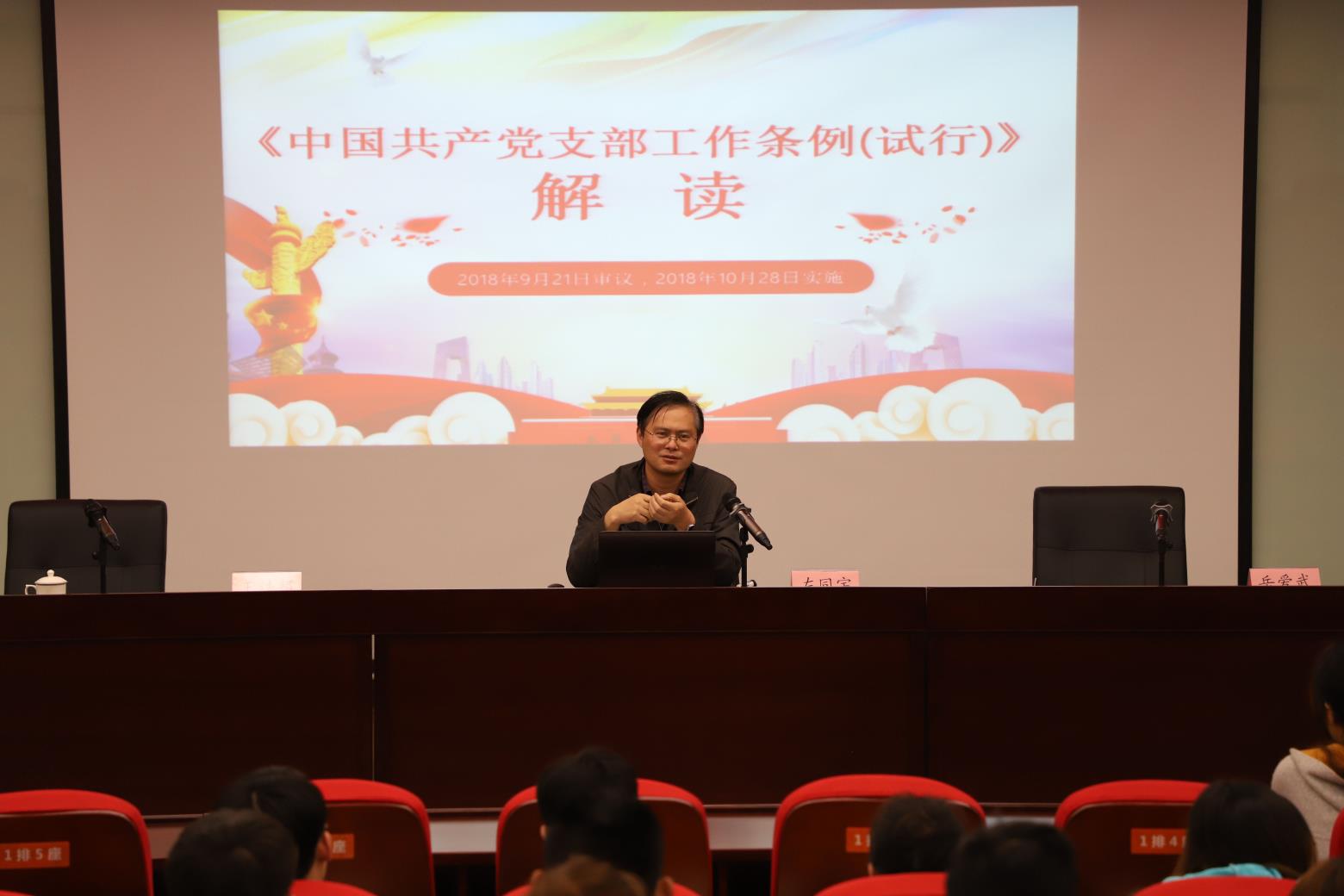 培训班第三讲,院党委书记左同宇为大家作了《党支部条例的解读》的报告,左书记从党支部工作程序、工作流程、支部如何建设、工作如何创新等方面进行了讲述,并勉励大家严格要求自己,加强学习,提升自我。